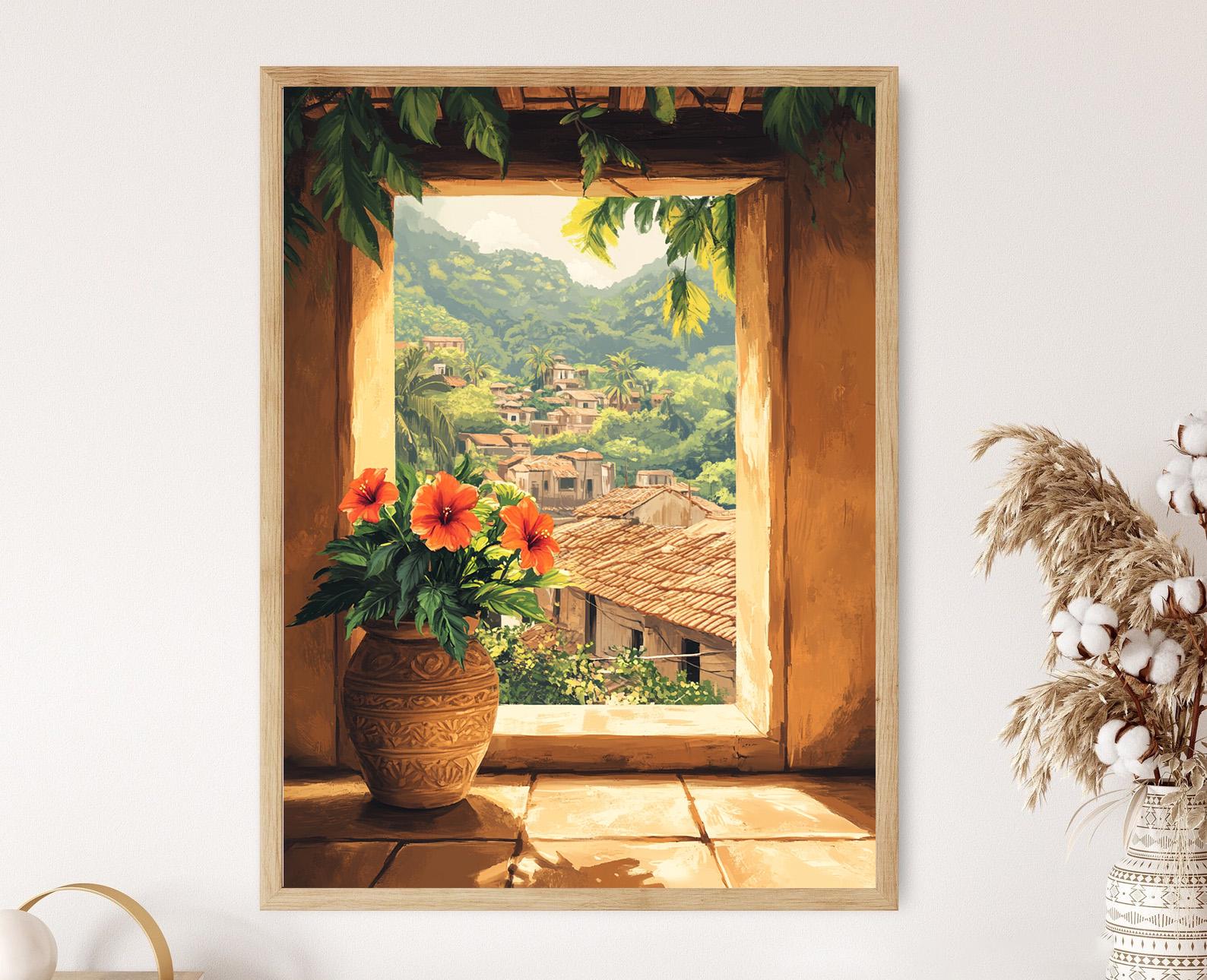 Découvrez cette affiche captivante qui met en lumière une fenêtre en bois de Chattogram ornée de motifs inspirés du jute, accompagnée d'un vase de fleurs d'hibiscus et d'une vue pittoresque sur les toits de la ville portuaire. Cette illustration riche en détails évoque à la fois le patrimoine culturel du Bangladesh et le charme maritime, faisant de ce poster mural une pièce unique pour votre décoration murale. Ajoutez une touche d'émotion et de caractère à votre art mural avec cette œuvre inspirante, parfaite pour égayer votre espace.