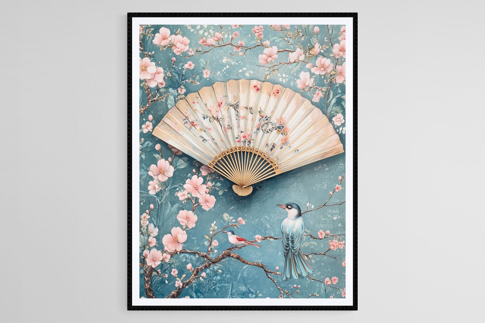 Affiche Chinoiserie – Poster Oiseaux et Fleurs, Décor Mural Bleu Doux