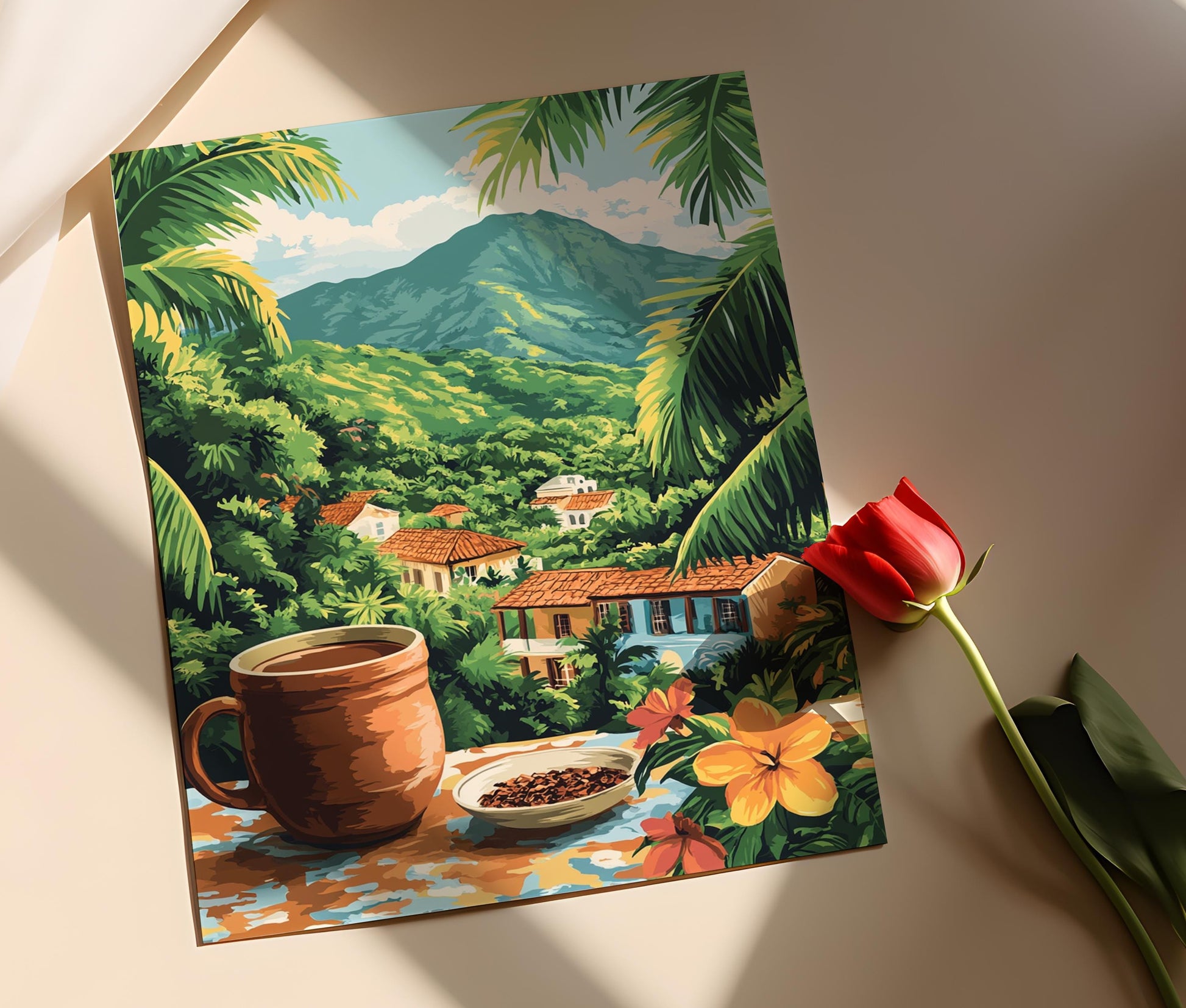 Découvrez cette magnifique affiche qui capture l'essence d'un moment chaleureux avec une tasse de chocolat chaud en poterie, entourée de textiles insulaires. L'illustration évoque une atmosphère paisible, mettant en avant le charme culturel de Nevis à travers le majestueux Pic de Nevis et l'architecture coloniale. Parfaite comme décoration murale, ce poster mural apportera une touche d'élégance rustique à votre art mural.