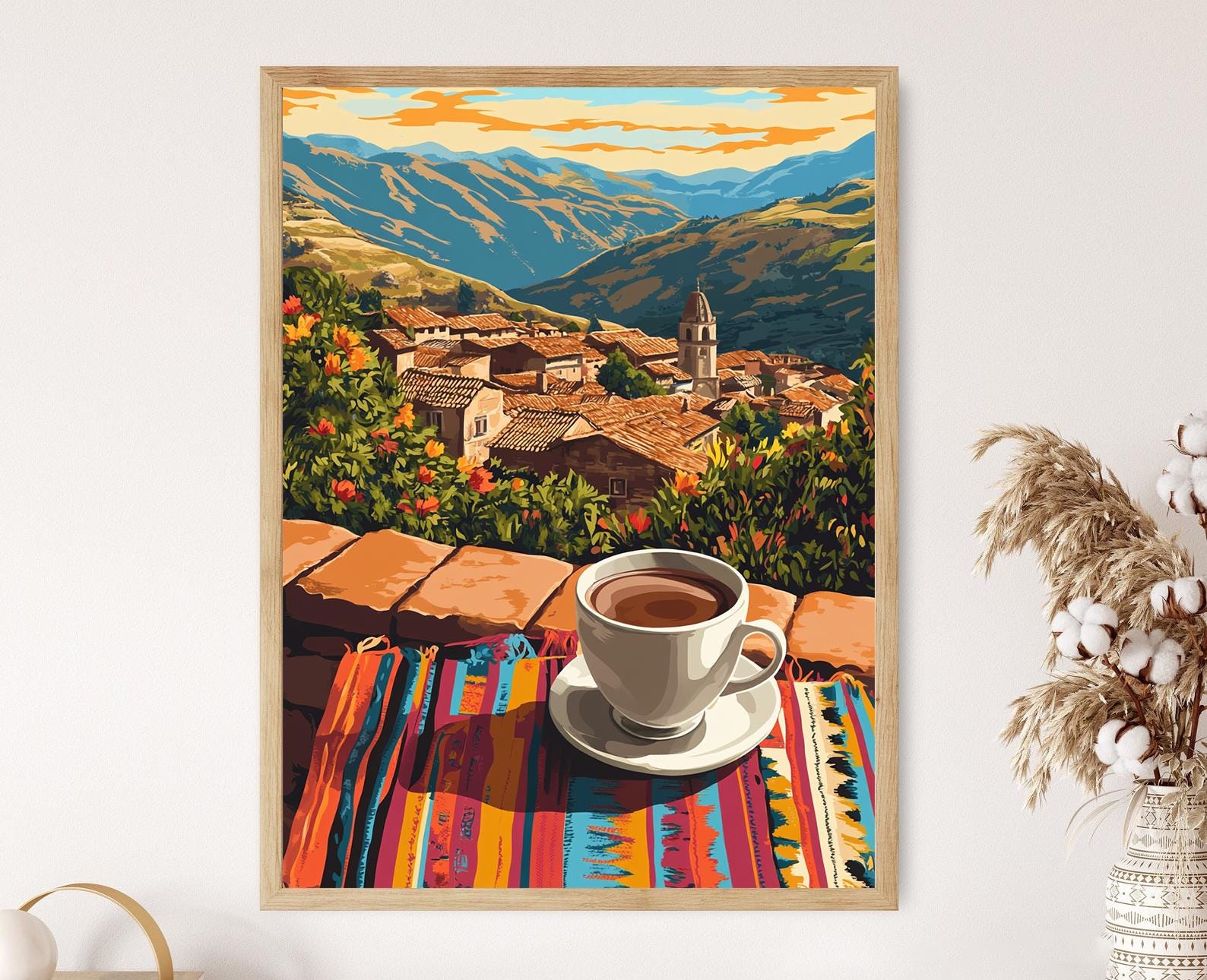 Découvrez cette affiche captivante qui évoque la douceur d'un chocolat chaud, délicatement présenté dans une tasse en céramique. Entourée de textiles andins colorés, cette illustration célèbre la culture riche de Cusco, avec ses collines en terrasses et ses bâtiments coloniaux. Idéale comme décoration murale, ce poster mural apportera une touche chaleureuse et authentique à votre art mural.