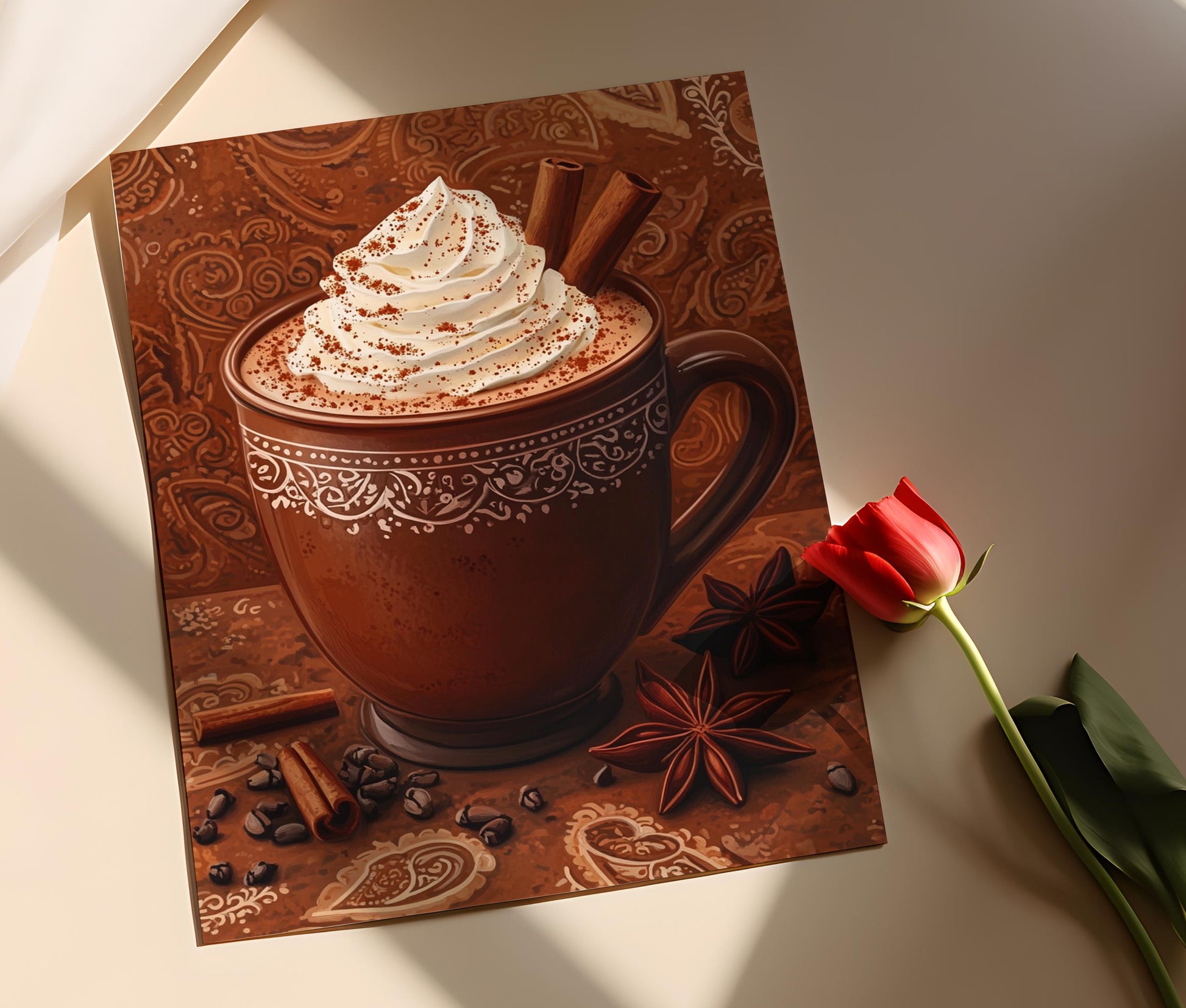 Découvrez cette magnifique affiche qui évoque la douceur d'un chocolat chaud indien, présenté dans un élégant kulhad en terre cuite, surmonté d'une crème fouettée. L'illustration captivante est enrichie d'un fond inspiré des motifs paisley, apportant une touche de chaleur et d’authenticité à votre décoration murale. Ce poster mural est idéal pour créer une ambiance cosy et accueillante dans votre intérieur, tout en sublimant votre art mural.