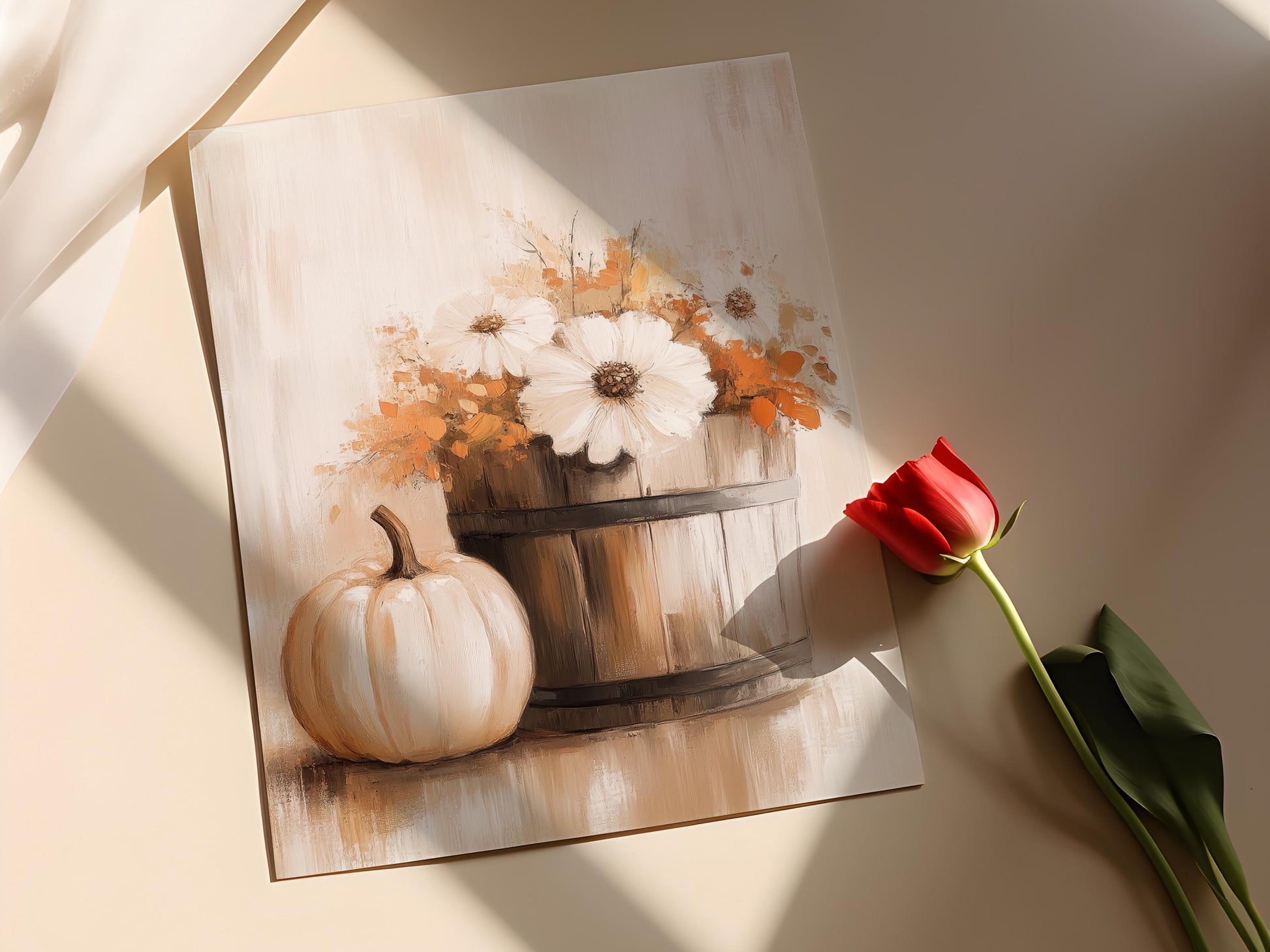 Ajoutez une touche chaleureuse à votre intérieur avec cette magnifique affiche illustrant un potiron rustique et des fleurs d'automne. Cette illustration douce et peinturlurée évoque l'élégance rustique, tout en diffusant des vibrations cocooning propres à la saison automnale. Idéale comme décoration murale, ce poster mural capture la beauté de la récolte et apportera une atmosphère accueillante à n'importe quel espace.
