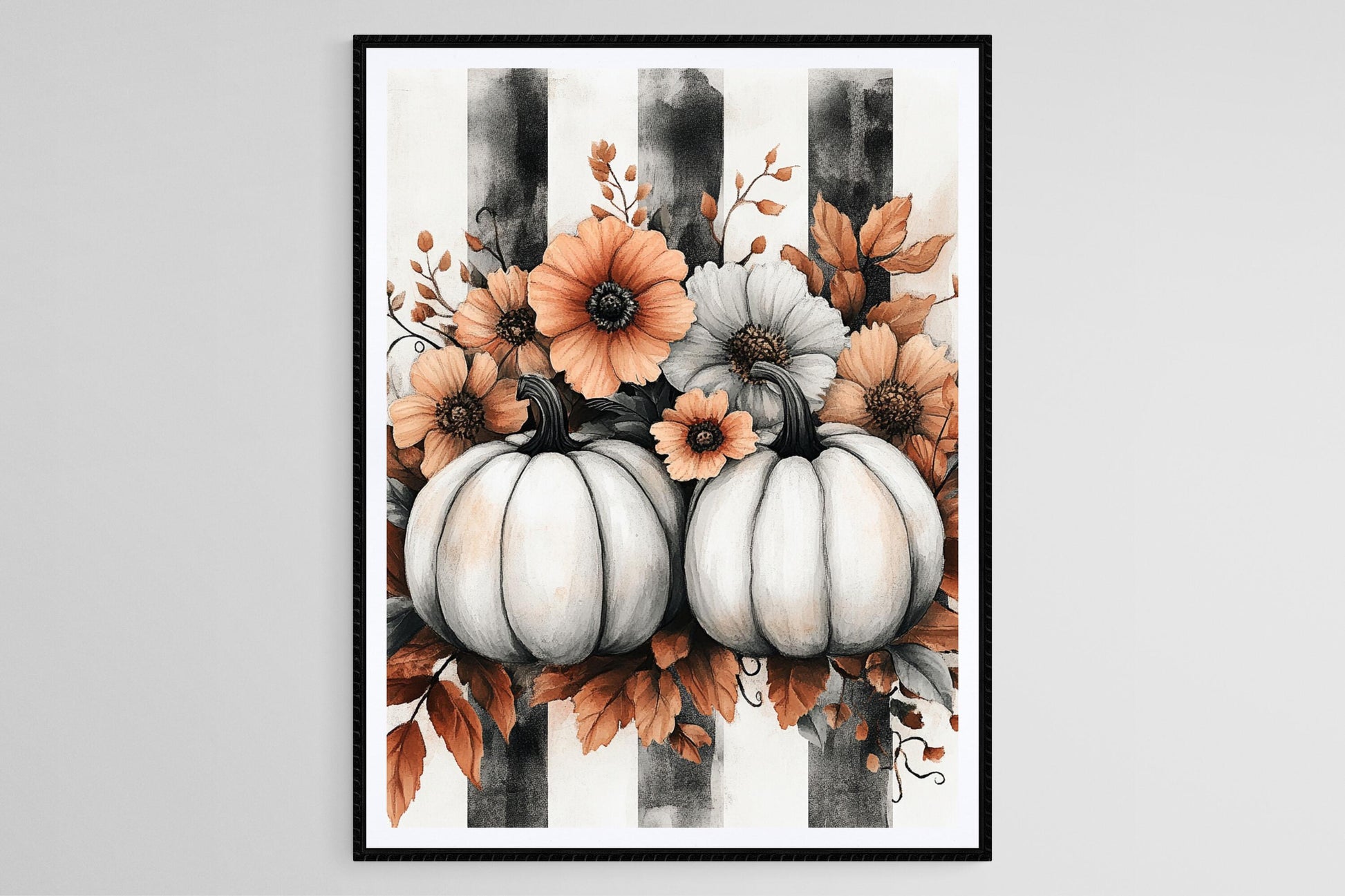 Découvrez cette affiche au style élégant, mettant en scène des citrouilles blanches délicatement posées sur un fond de rayures noires et blanches. Cette illustration allie harmonieusement des tons automnaux chaleureux, créant une atmosphère à la fois saisissante et réconfortante. Parfaite pour enrichir votre décoration murale, ce poster mural apportera une touche de charme saisonnier à votre intérieur, idéal pour les amateurs de styles modernes et rustiques.