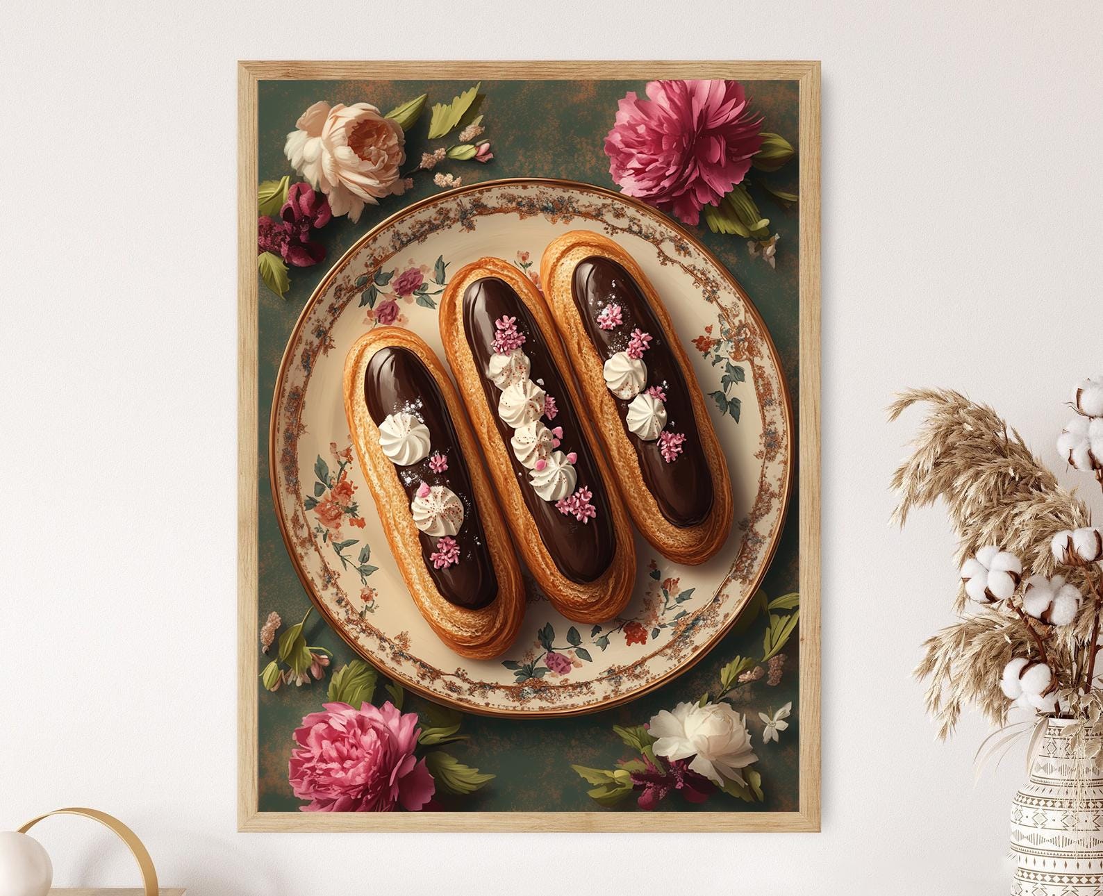 Découvrez notre affiché charmante mettant en scène des éclairs français brillamment glacés au chocolat, délicatement disposés sur une assiette ornée de motifs floraux. Cette illustration évoque une atmosphère douce et gourmande, idéale pour apporter une touche d'élégance à votre décoration murale. Transformez votre intérieur avec ce poster mural captivant, parfait pour les amateurs d'art mural et de pâtisserie.