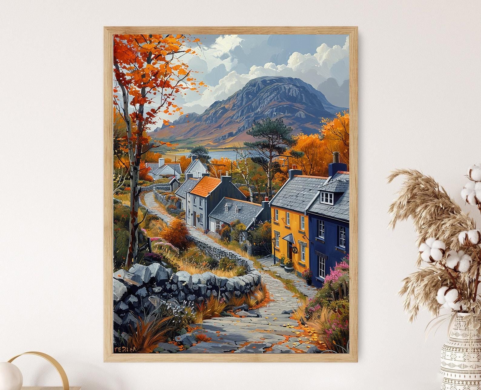 Découvrez notre affiche captivante qui vous transporte au cœur des charmants petits villages d'Irlande. Cette illustration vibrante et colorée reflète l'essence des paysages irlandais, des maisons pittoresques de Dingle aux rues animées de Kinsale, créant une décoration murale qui évoque à la fois sérénité et charme historique. Un véritable art mural qui enrichit votre intérieur en célébrant la beauté et la culture irlandaise.