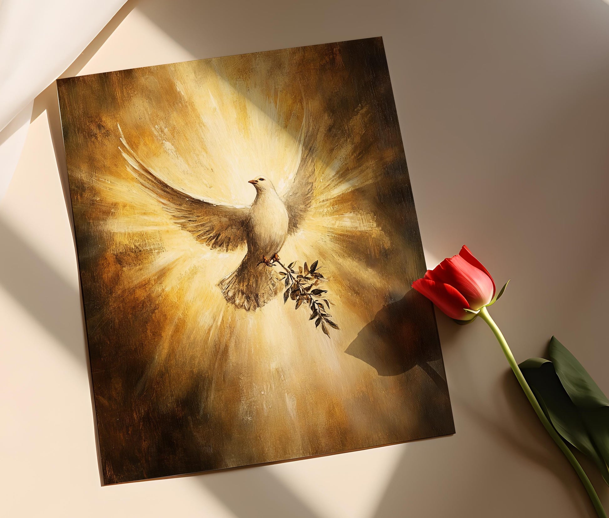 Découvrez cette affiche captivante représentant une colombe portant une branche d'olivier, symbole universel de paix et de Saint-Esprit. Entourée de rayons dorés, cette illustration émane une sérénité apaisante, idéale pour enrichir votre décoration murale et apporter une touche spirituelle à votre art mural. Transformez votre espace avec ce poster mural inspirant qui éveillera des émotions de calme et de foi.