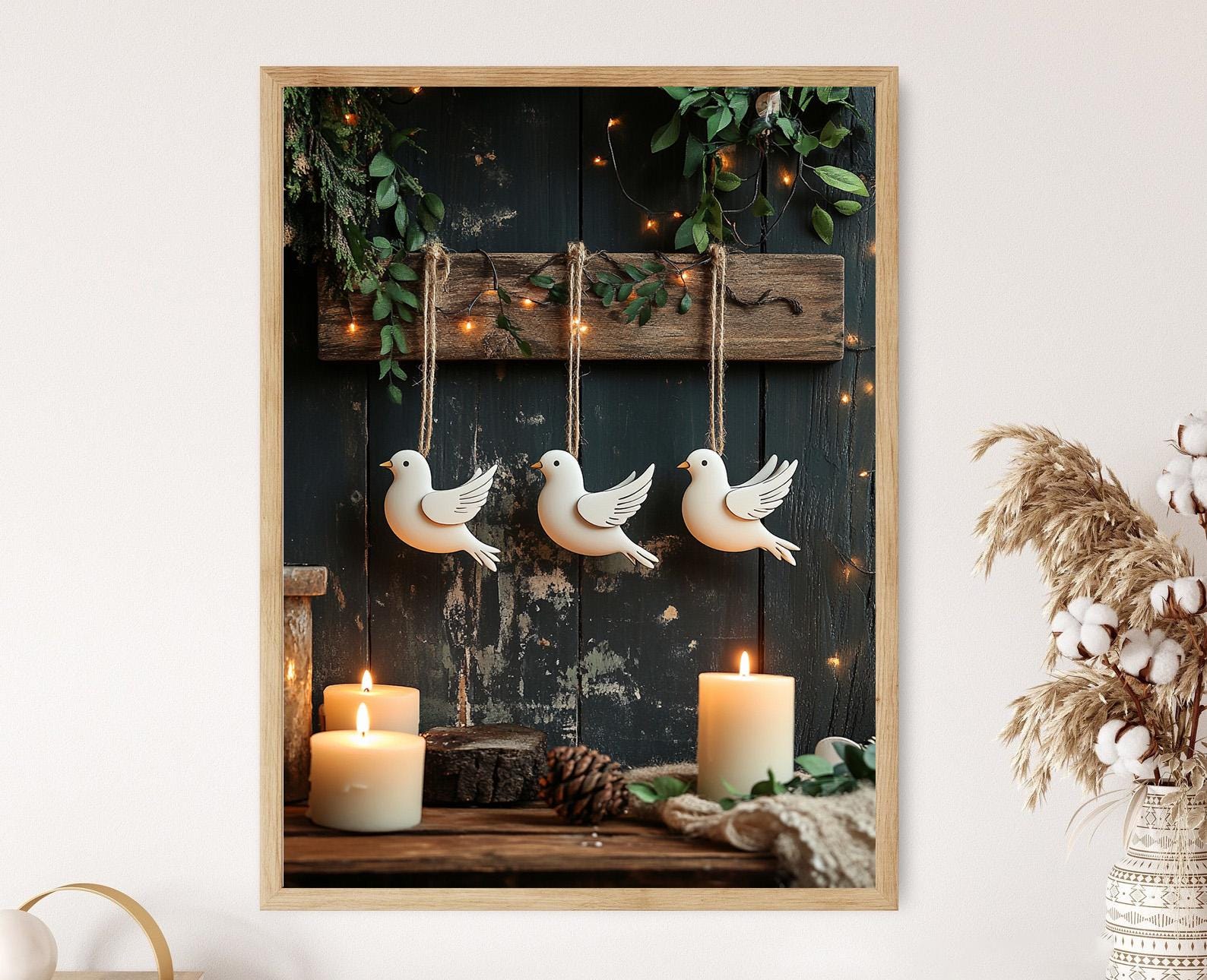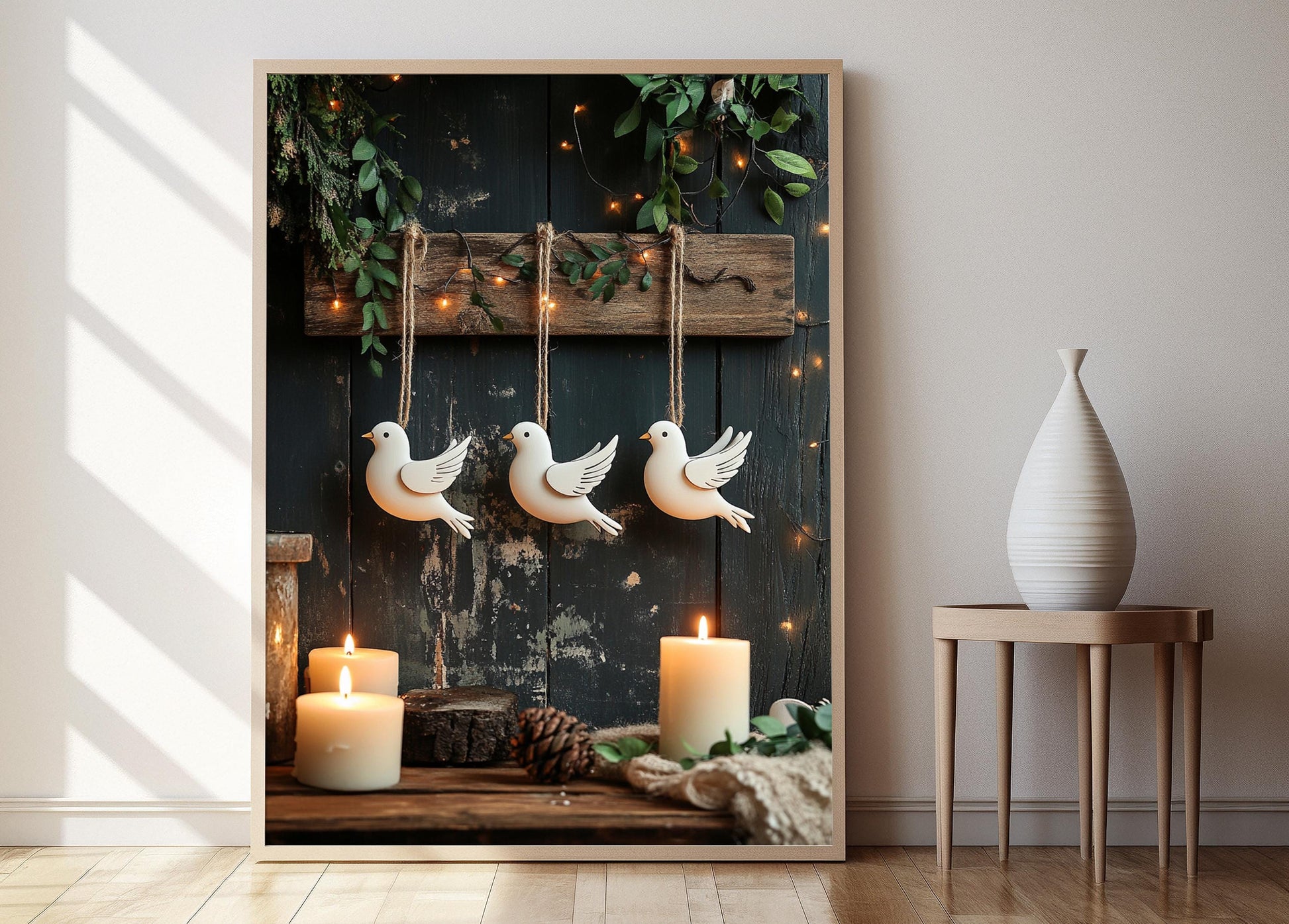 Découvrez cette magnifique affiche qui capture l'essence de la paix et de la foi à travers une illustration délicate de colombes en bois ornées de branches d'olivier. Ce poster mural évoque une atmosphère sereine grâce à ses éléments rustiques, tels que des bougies suspendues et de la vigne, apportant une touche de charme à votre décoration murale. Parfait pour enrichir votre art mural, cette œuvre rappelle la beauté des symboles intemporels.