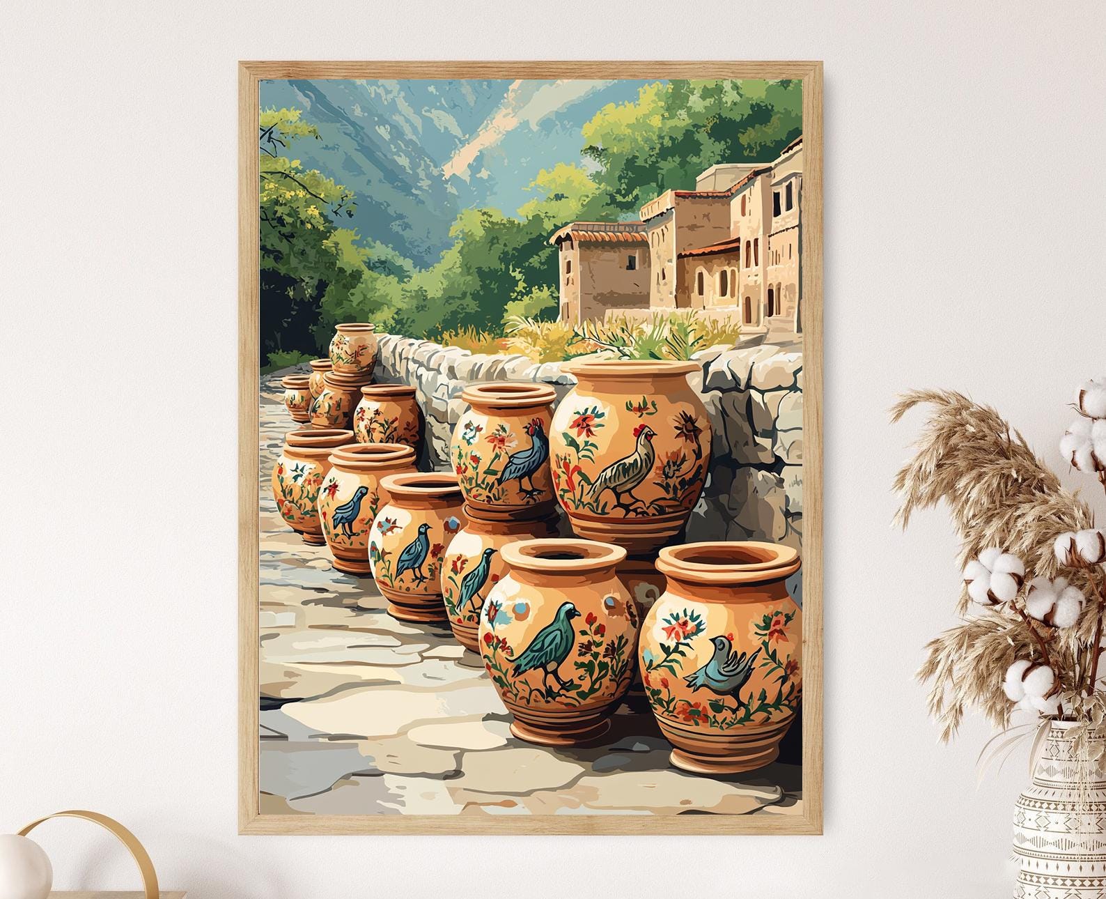 Découvrez cette affiche captivante qui illustre la beauté du patrimoine punjabi à travers une composition chaleureuse. Avec des pots en argile ornés de motifs paisley et un coq vibrant, cette décoration murale évoque une atmosphère rustique et accueillante, parfaite pour apporter une touche d'authenticité à votre art mural. L'illustration dégage une sérénité bucolique, idéale pour embellir votre intérieur.
