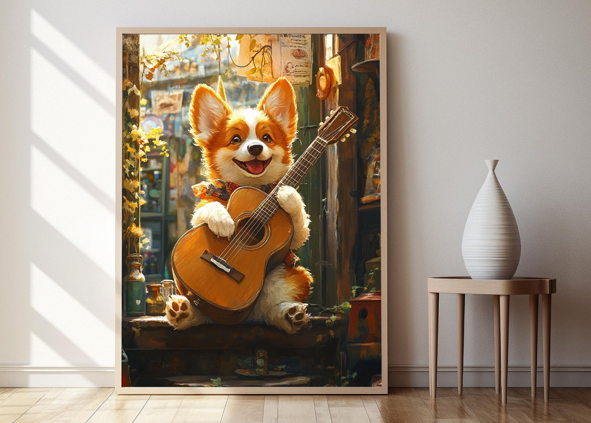 Découvrez cette affiche charmante mettant en scène un adorable chiot Corgi jouant de la guitare, une illustration qui allie humour et tendresse. Ce poster mural, à la stylisation ludique, apportera une touche d'émotion et de joie à votre décoration murale, parfaite pour les amoureux des animaux et de la musique. Laissez cet art mural unique égayer votre intérieur et créer une atmosphère chaleureuse.