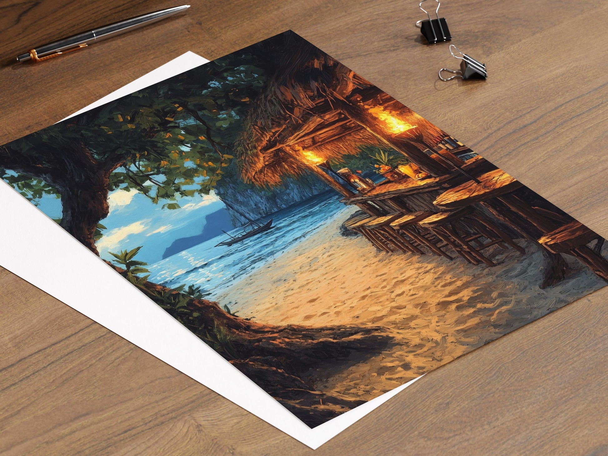 Plongez au cœur des tropiques avec cette affiche captivante illustrant le Coron Island Beach Bar, où les torches tiki et les cocktails à la fruit de la passion évoquent une atmosphère estivale et ensoleillée. Cette décoration murale, vibrante et exotique, apportera une touche de fraîcheur à votre intérieur et fera de votre mur une véritable invitation au voyage. Idéale pour créer un art mural inspirant, cette illustration transforme n'importe quel espace en un havre de paix tropical.