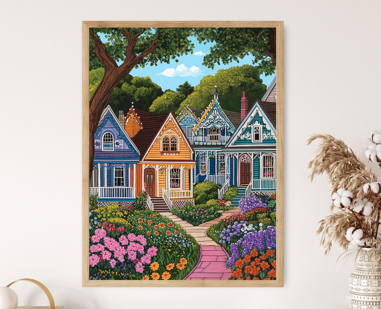 Découvrez cette affiche captivante qui met en lumière le charme vibrant des célèbres cottages en pain d'épice de Martha's Vineyard. Avec son illustration riche en détails et ses couleurs éclatantes, ce poster mural évoque une atmosphère à la fois joyeuse et nostalgique, parfaite pour égayer votre décoration murale et apporter une touche d'élégance victorian dans votre intérieur. Un véritable art mural qui séduira les amateurs d'esthétique côtière!