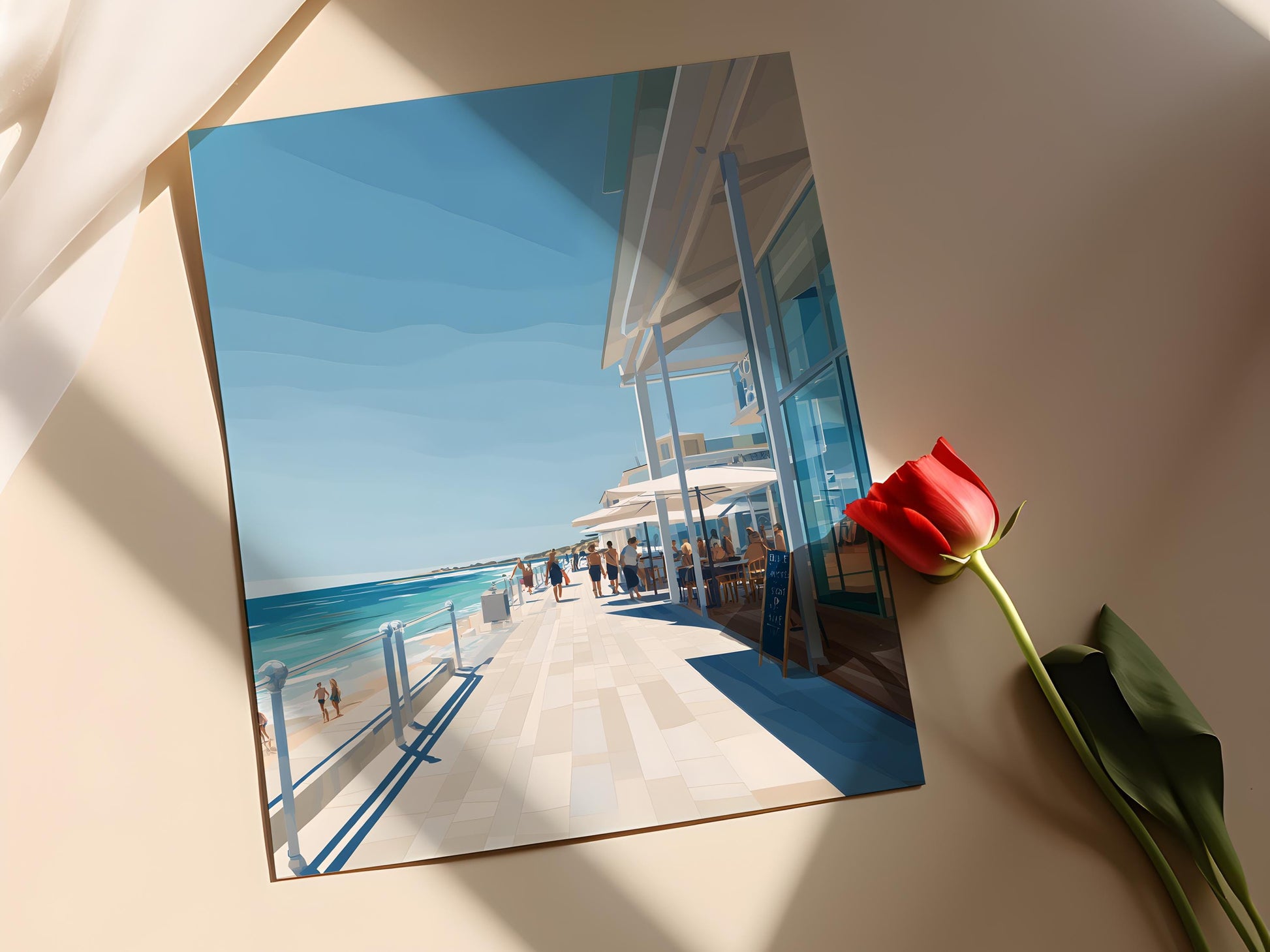 Découvrez cette affiche vibrante qui immortalise le charmant boardwalk de Cottesloe en Australie, avec une terrasse de café ensoleillée surplombant la plage. L'illustration capte l'essence joyeuse de la vie côtière, où des nageurs déambulent sous les rayons dorés du soleil, ajoutant une touche moderne avec les reflets des fenêtres en verre. Parfaite pour une décoration murale inspirante, cet art mural évoque des moments de détente et de convivialité.