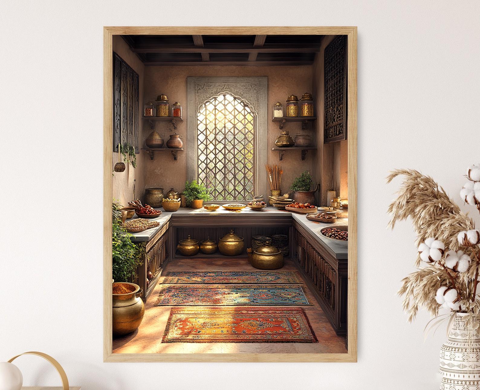 Découvrez notre affiche captivante qui évoque l'élégance rustique d'une cuisine de Peshawar, ornée de kilims colorés, de pots en laiton et de boîtes à épices en bois. Cette illustration chaleureuse et riche en culture apporte une touche authentique à votre décoration murale, transformant tout espace en une galerie d'art mural inspirante. Laissez-vous séduire par l'harmonie des couleurs et des détails qui célèbrent les traditions artisanales de cette région.