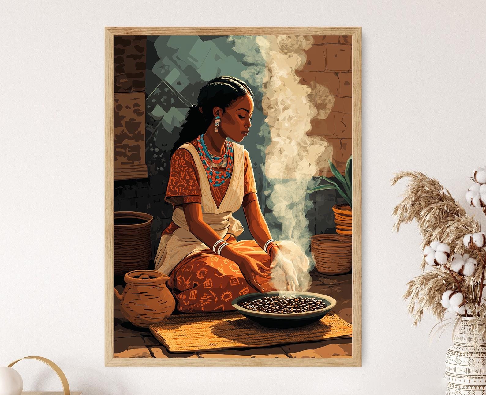 Découvrez cette magnifique affiche qui capture l'essence de la tradition éthiopienne à travers une illustration vibrante d'une femme réalisant la cérémonie du café Bunna. L'art mural, riche en couleurs et en détails, évoque une ambiance chaleureuse et conviviale, parfaitement complétée par des éléments artisanaux tels que des paniers tissés et un pot en terre cuite jebena. Cette décoration murale apportera une touche d'authenticité et de culture à votre intérieur.