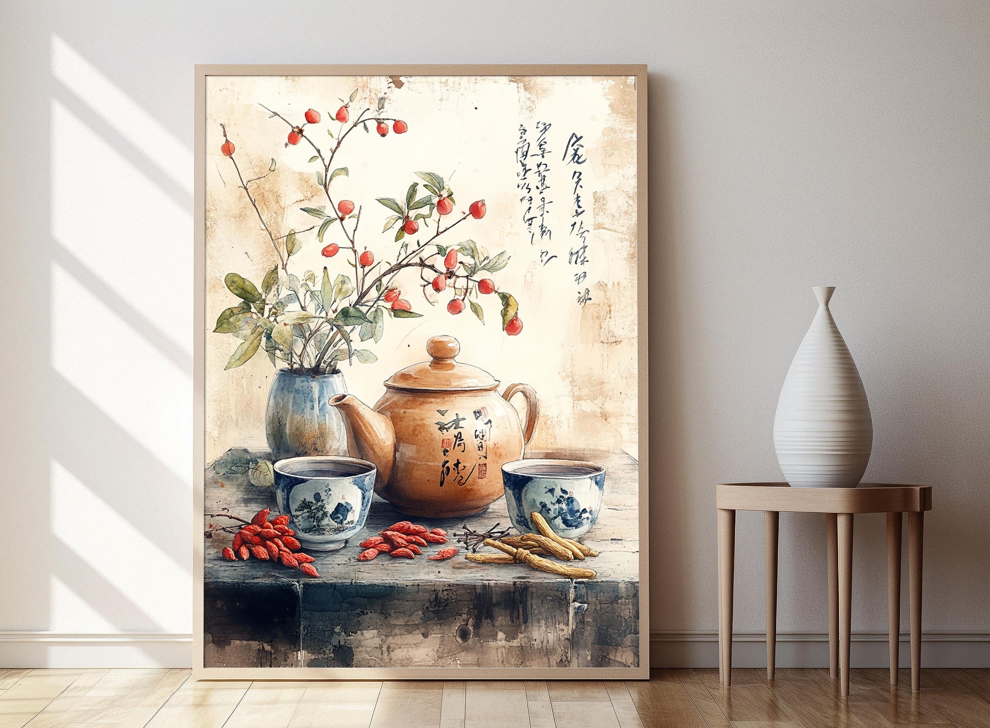 Découvrez cette magnifique affiche qui évoque la sérénité grâce à une illustration délicate de thé herbal chinois servi dans une théière en argile Yixing. Entourée de baies de goji et de ginseng, cette décoration murale capture l'essence de la culture chinoise et invite à la détente. Parfait pour apporter une touche de bien-être et d’harmonie à votre art mural.