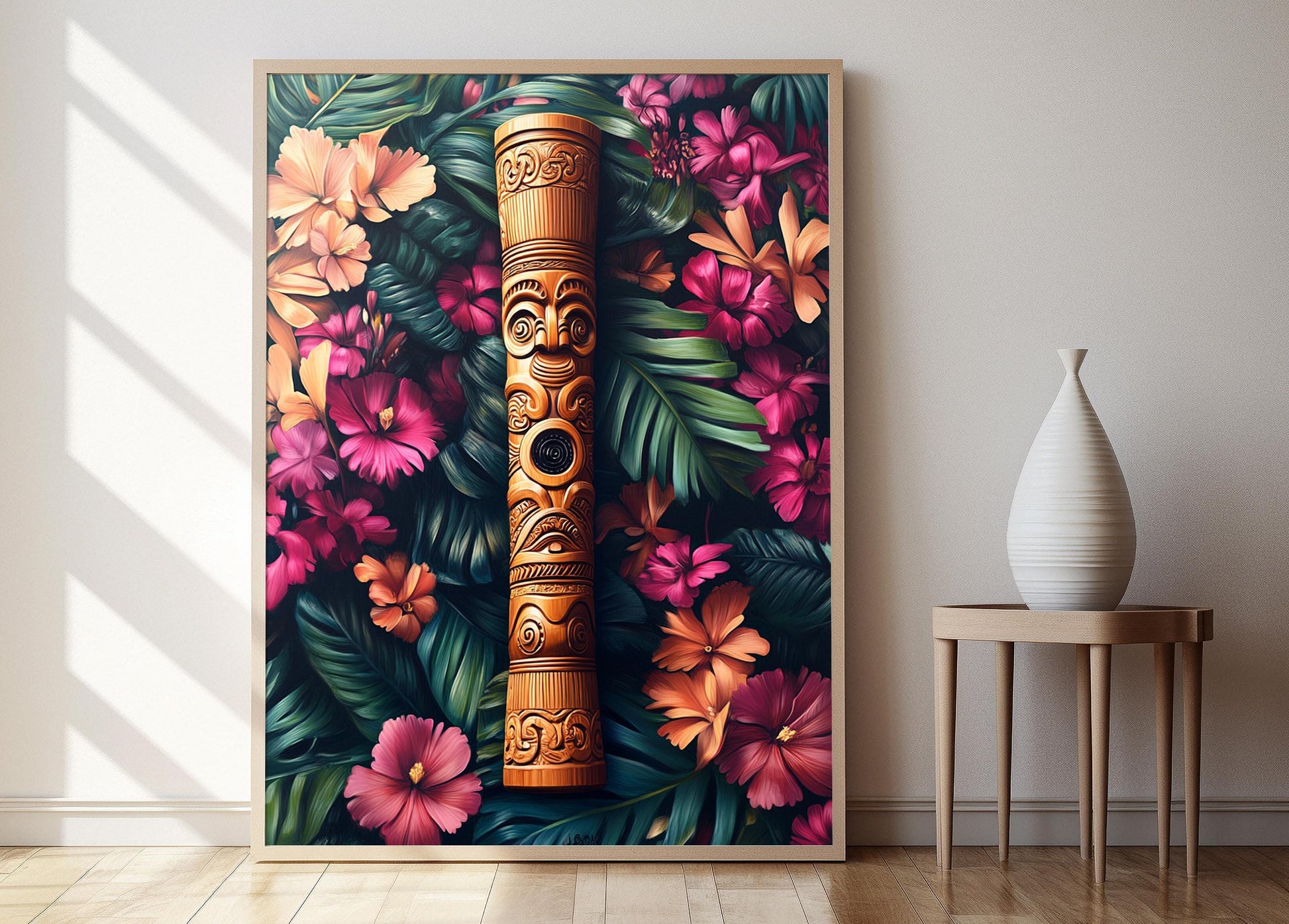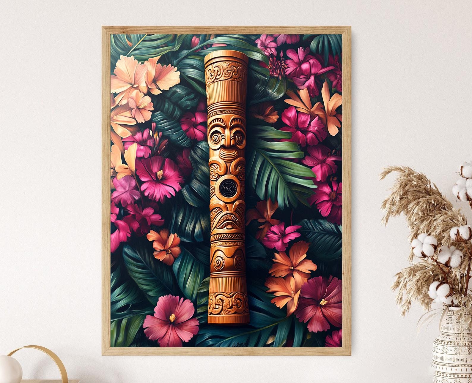 Découvrez notre affiche captivante mettant en scène un pu kaea, une trompette de guerre maorie ornée de gravures délicates, sur un fond floral vibrant. Cette illustration évoque la richesse de l'héritage culturel maori et apporte une touche d'élégance à votre décoration murale. Parfaite pour ajouter une dimension artistique et émotionnelle à votre intérieur, ce poster mural transforme votre espace en une célébration des traditions cérémoniales.
