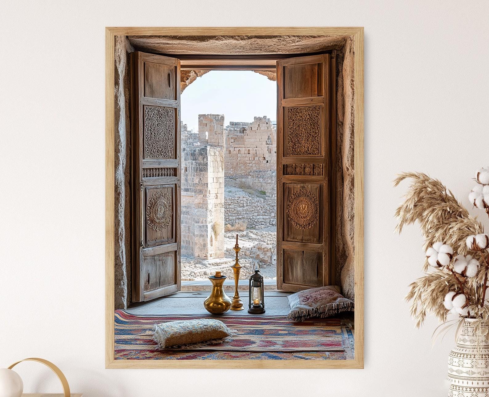 Découvrez cette magnifique affiche qui capture l'essence de l'histoire syrienne à travers un élément en bois traditionnel orné de motifs levantins. L'illustration met en valeur une vue époustouflante des ruines anciennes de Daraa, mêlant des éléments artisanaux qui ajoutent une profondeur culturelle à votre décoration murale. Ce poster mural évoque un voyage dans le temps, apportant une touche d'élégance et de sérénité à votre art mural.