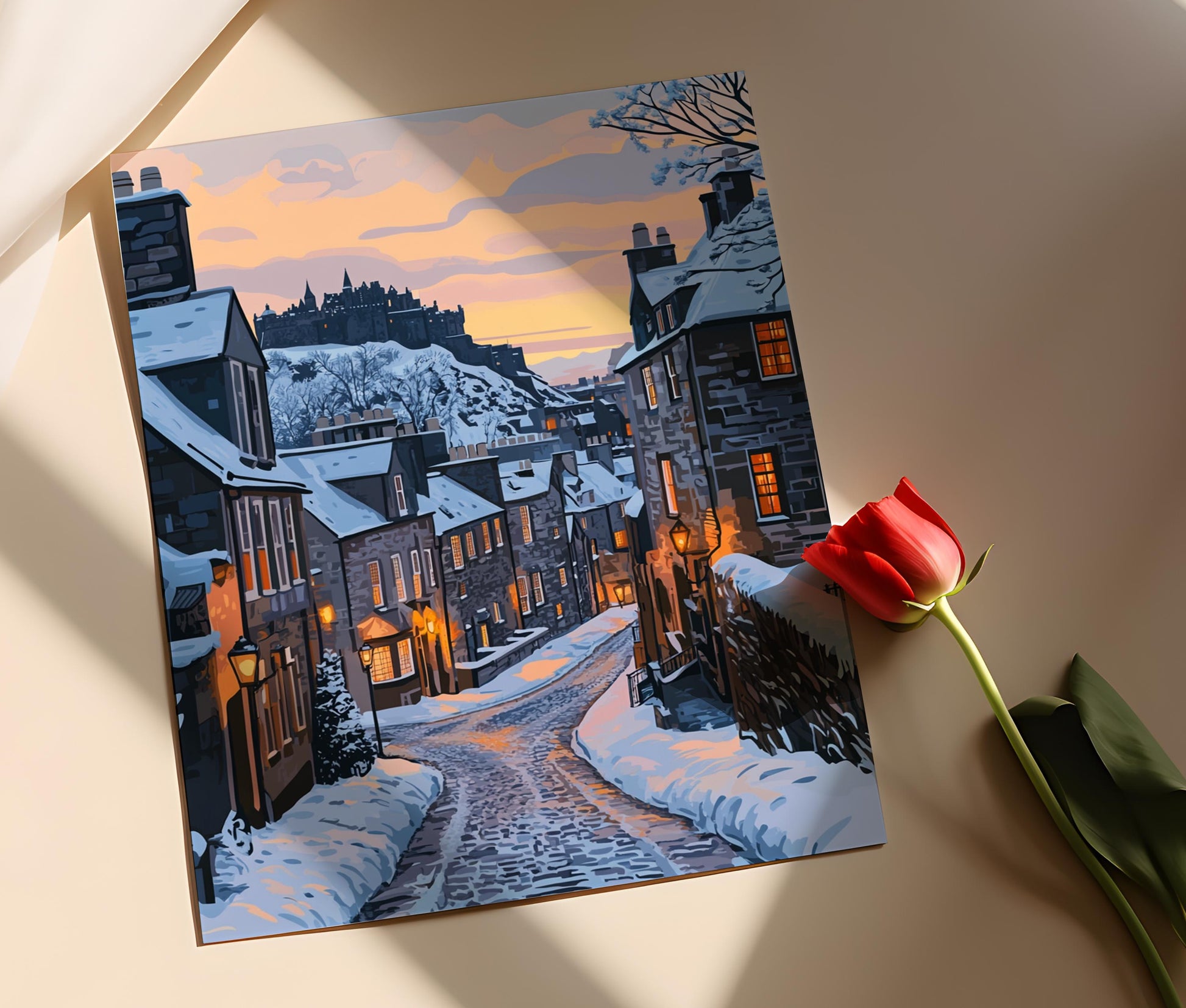Découvrez notre affiche Édimbourg Hiver, une illustration captivante qui capture la magie d'une ville historique écossaise sous un manteau de neige. Ce poster mural évoque une atmosphère nostalgique et chaleureuse, parfaite pour ajouter une touche de charme à votre décoration murale. L'art mural dépeint des détails pittoresques, vous transportant au cœur d'un hiver féerique à Édimbourg.