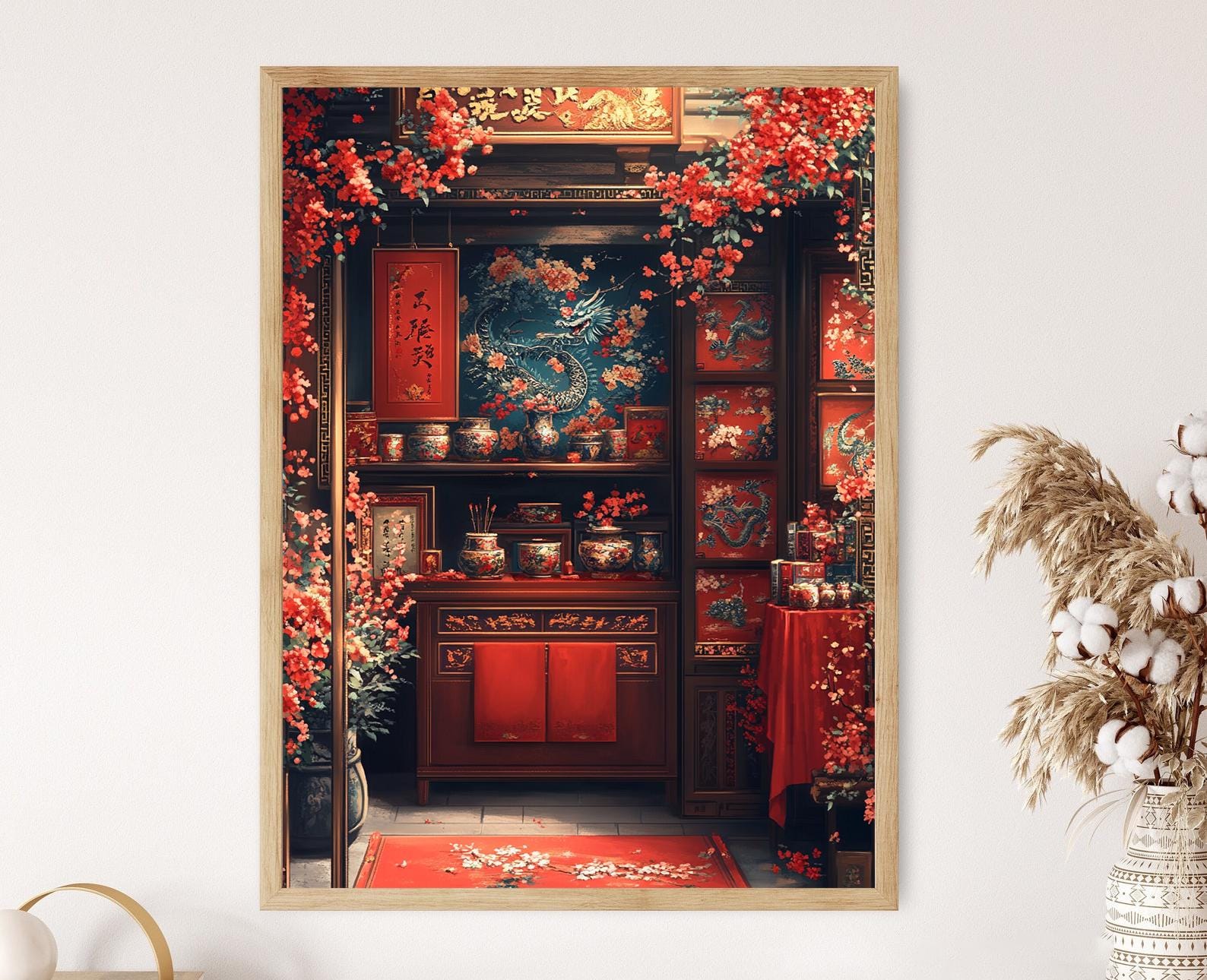 Découvrez cette affiche captivante qui évoque la magie d'une boutique de cadeaux chinoise, ornée de céramiques aux motifs de dragons, de rouleaux peints et de bijoux dorés. Cette illustration vibrante et colorée apporte une touche festive à votre décoration murale, célébrant avec élégance l'héritage culturel chinois. Un véritable art mural qui transformera votre espace en une expérience culturelle unique.