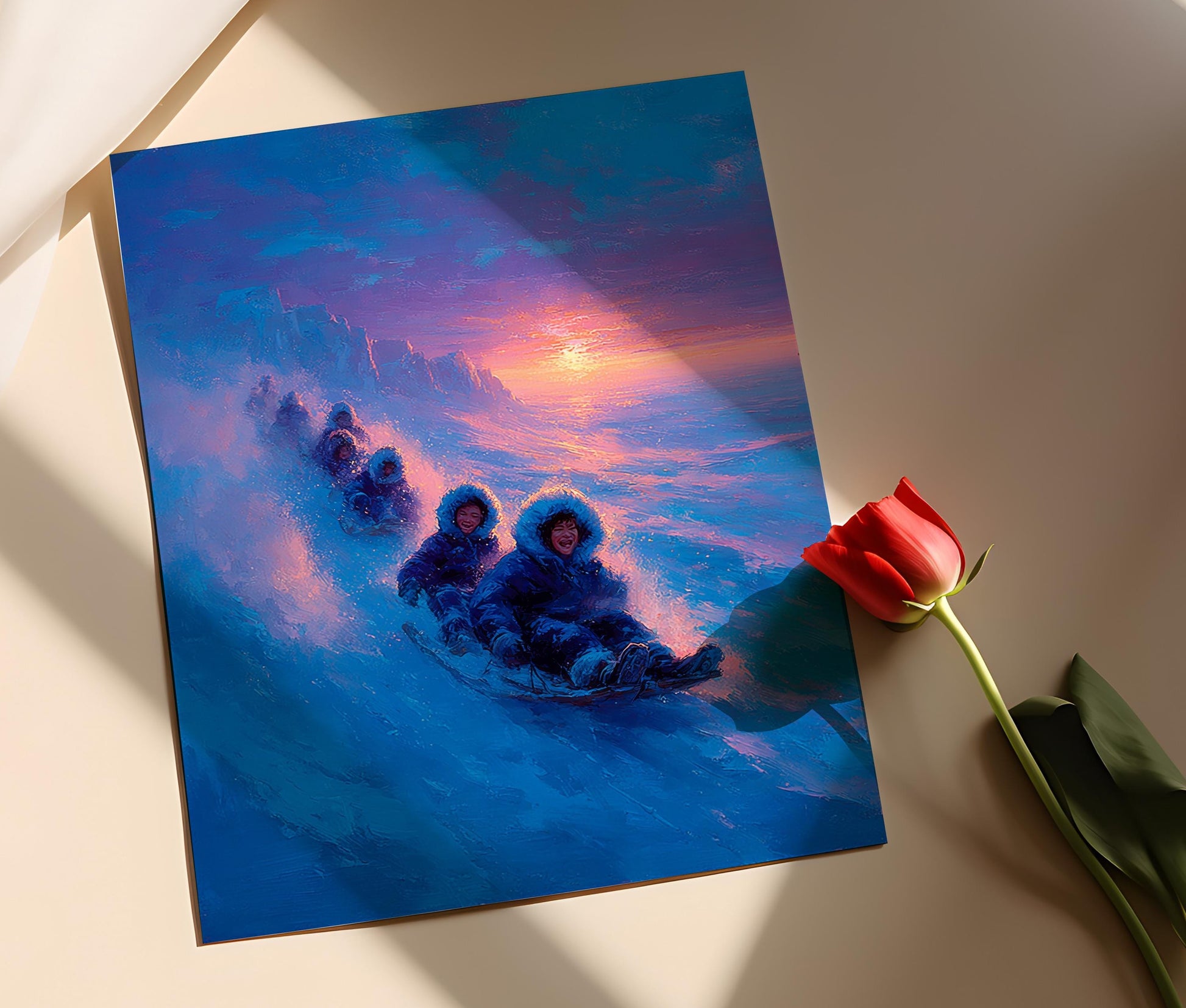 Affiche Enfants Inuit en Luge – Poster Art de l'Enfance Arctique