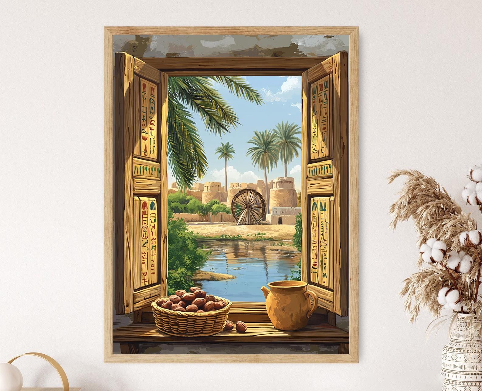 Découvrez cette affiche captivante qui met en avant une fenêtre en bois finement sculptée, ornée de motifs égyptiens, s'ouvrant sur un panorama enchanteur des roues à eau historiques de Fayoum, entourées de palmiers luxuriants. Cette illustration évoque l'artisanat traditionnel égyptien et apporte une touche d'exotisme à votre décoration murale. Idéal pour enrichir votre espace avec une ambiance authentique, ce poster mural est une véritable invitation au voyage visuel.