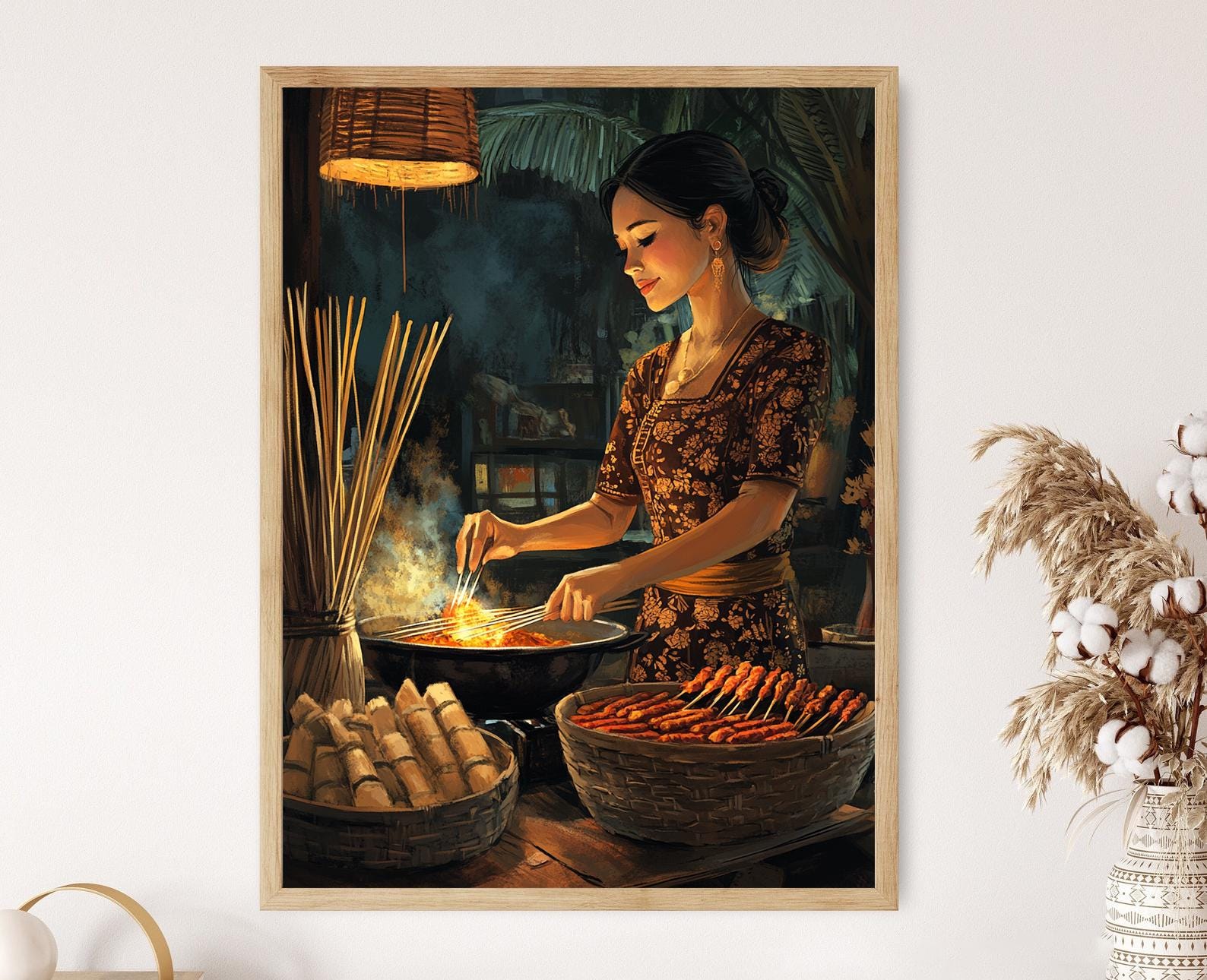 Affiche Femme Indonésienne Cuisinant Satay – Illustration Cuisine Traditionnelle