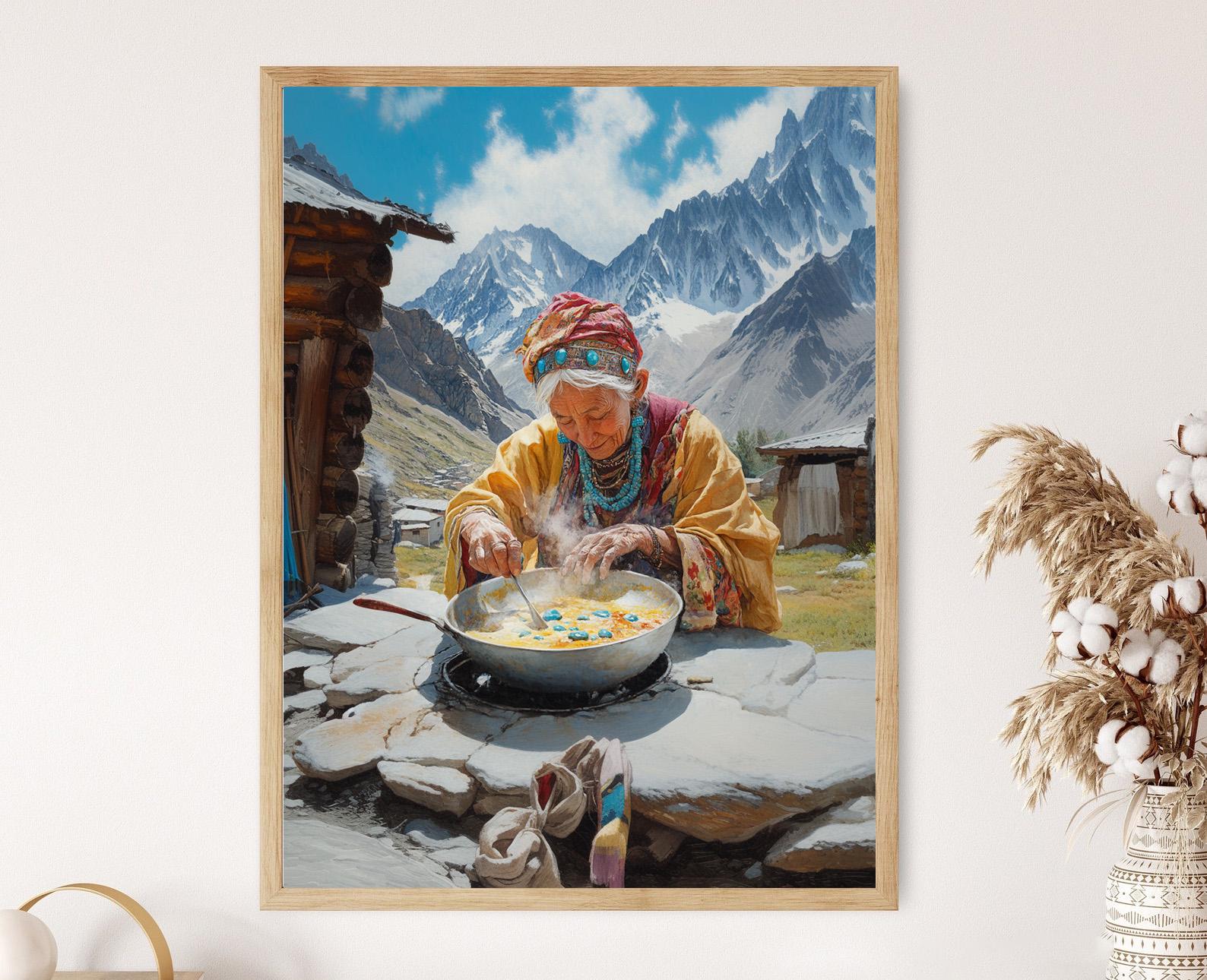 Découvrez cette magnifique affiche illustrant une femme ladakhie en pleine préparation de plats traditionnels, coiffée du perak emblématique orné de pierres turquoises. Ce poster mural évoque la richesse culturelle des Himalayas, apportant une touche d'authenticité et de charme à votre décoration murale. L'illustration vibrante et détaillée crée une atmosphère chaleureuse qui fera de votre espace un véritable havre de paix.