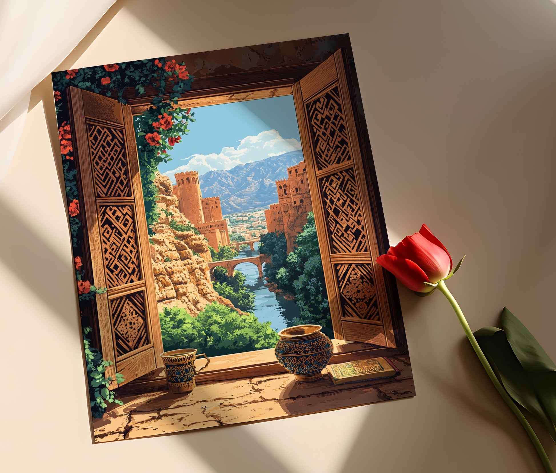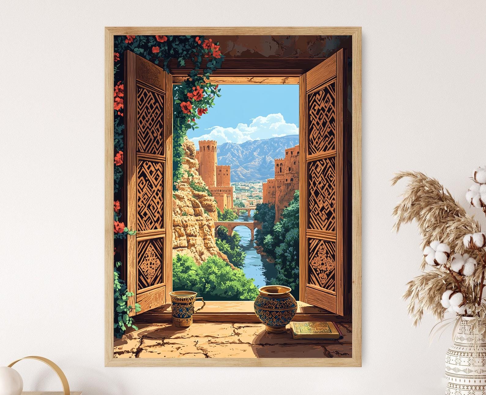 Découvrez cette affiche captivante mettant en scène une fenêtre en bois algérienne ornée de sculptures mauresques délicates. L'illustration offre une vue plongeante sur les célèbres ponts de Constantine, évoquant une atmosphère de voyage et d'histoire. Idéale pour enrichir votre décoration murale, ce poster mural ajoutera une touche d'élégance et d'exotisme à votre art mural.