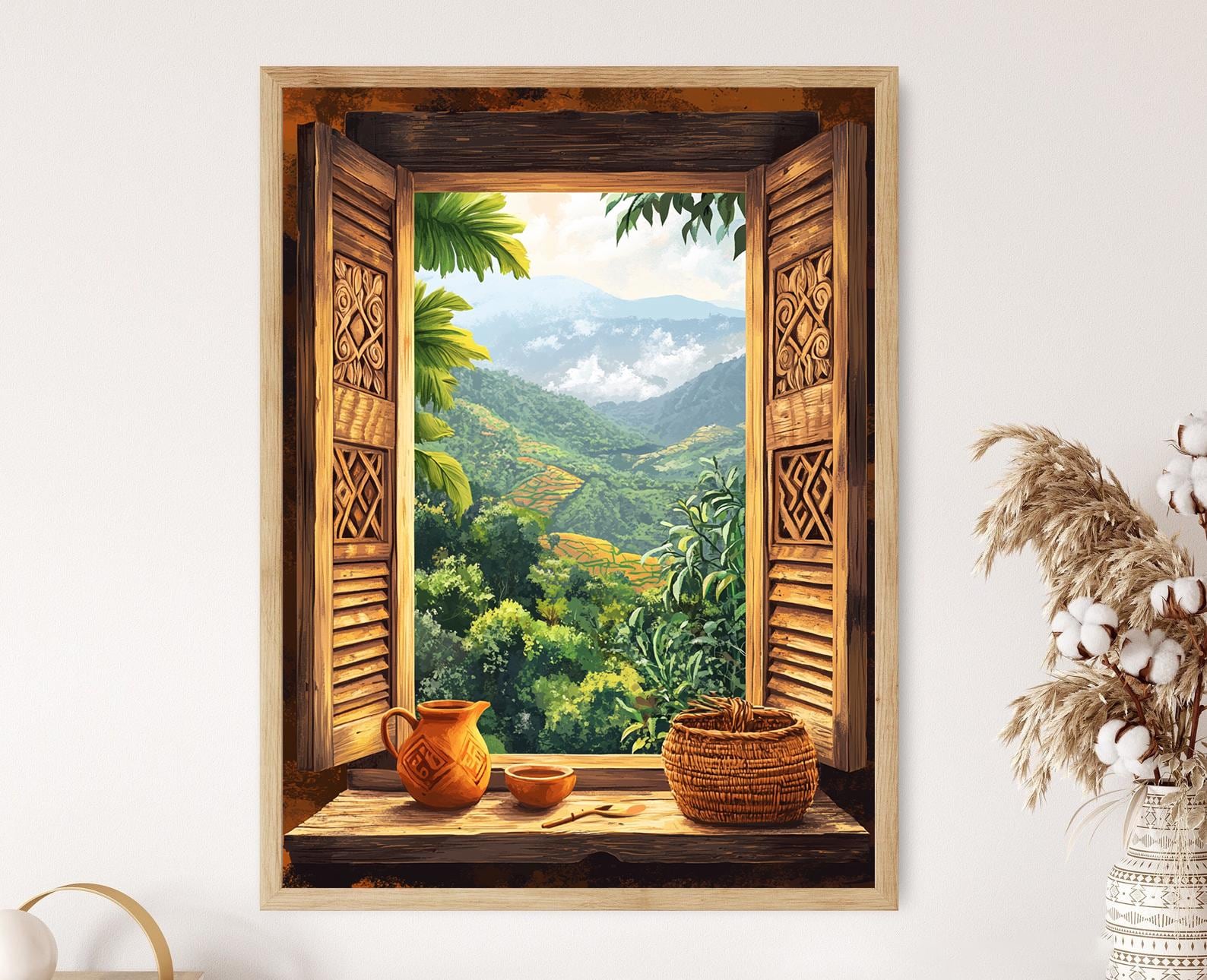 Découvrez cette magnifique affiche qui met en valeur une fenêtre en bois kenyane ornée de motifs folkloriques Luo, offrant une vue apaisante sur les riches hauts plateaux et les champs de thé d'Eldoret. Cette illustration captivante évoque une atmosphère de sérénité et de tradition, parfaite pour enrichir votre décoration murale. Un véritable art mural qui apportera une touche d'authenticité à votre intérieur.