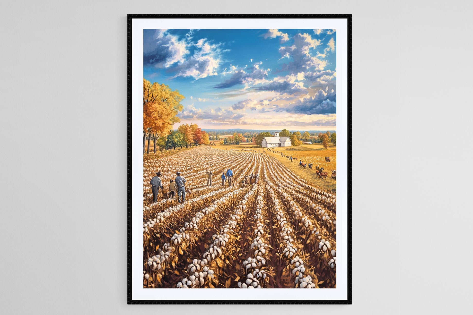 Découvrez cette magnifique affiche qui illustre la beauté des champs de coton de l'Arkansas durant la saison des récoltes. Avec ses couleurs chaudes et ses détails saisissants, ce poster mural évoque une atmosphère de tradition et de charme du Sud, parfait pour enrichir votre décoration murale. Cette illustration captivante apportera une touche d'art mural authentique à n'importe quel espace.