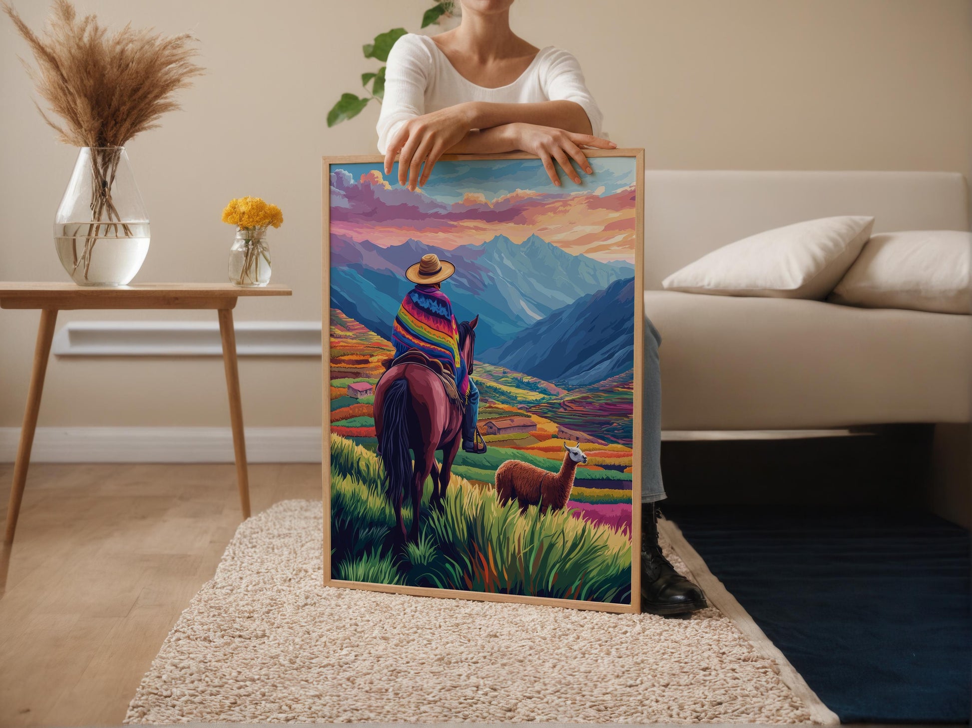 Découvrez cette magnifique affiche qui met en scène un fermier péruvien à cheval, entouré de champs en terrasses et de majestueux lamas, le tout sous un ciel pastel. Cette illustration évoque une célébration des traditions rurales du Pérou, apportant une touche d'authenticité et de sérénité à votre décoration murale. Idéale pour enrichir votre art mural, ce poster mural saura transporter vos espaces vers de nouveaux horizons.