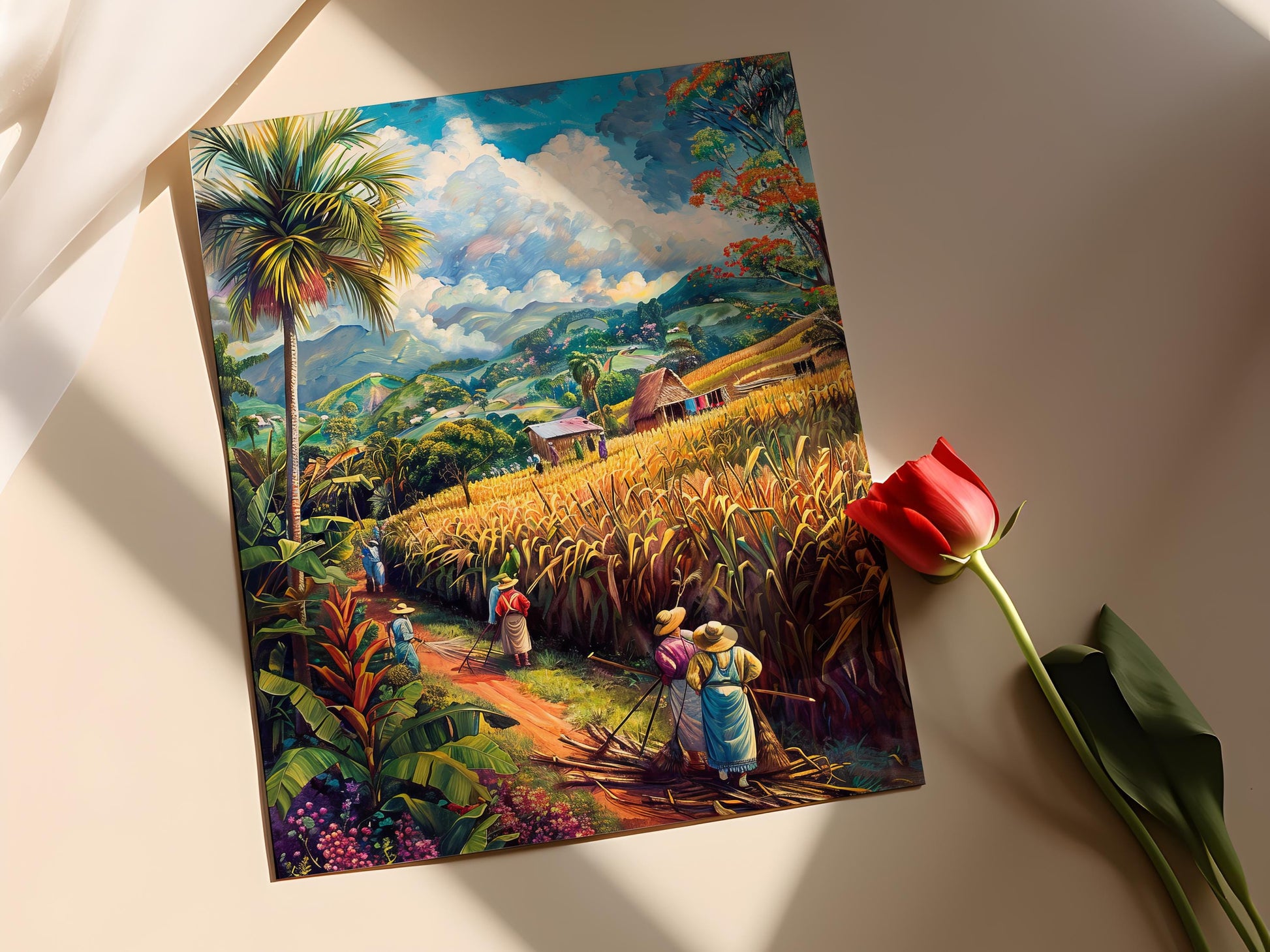 Découvrez cette affiche captivante qui illustre la vie rurale costaricaine avec une touche d'authenticité. Ce poster mural, riche en détails et en émotions, évoque l'esprit des agriculteurs de canne à sucre, apportant une ambiance chaleureuse et traditionnelle à votre décoration murale. Idéale pour embellir votre intérieur avec une illustration qui célèbre le travail acharné et la beauté de la nature.