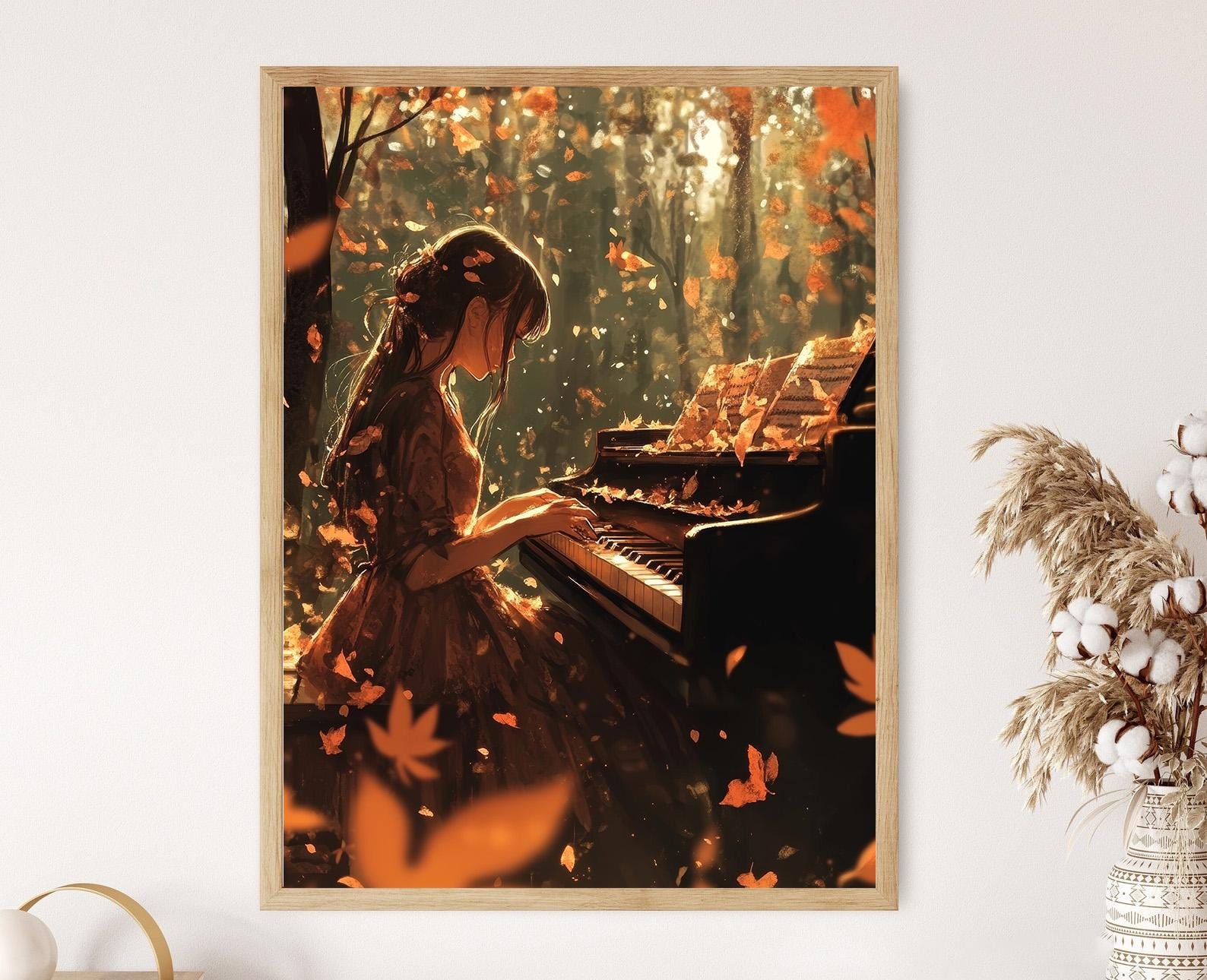 Affiche Fille au Piano d'Automne – Art de Scène Musical Enchantée