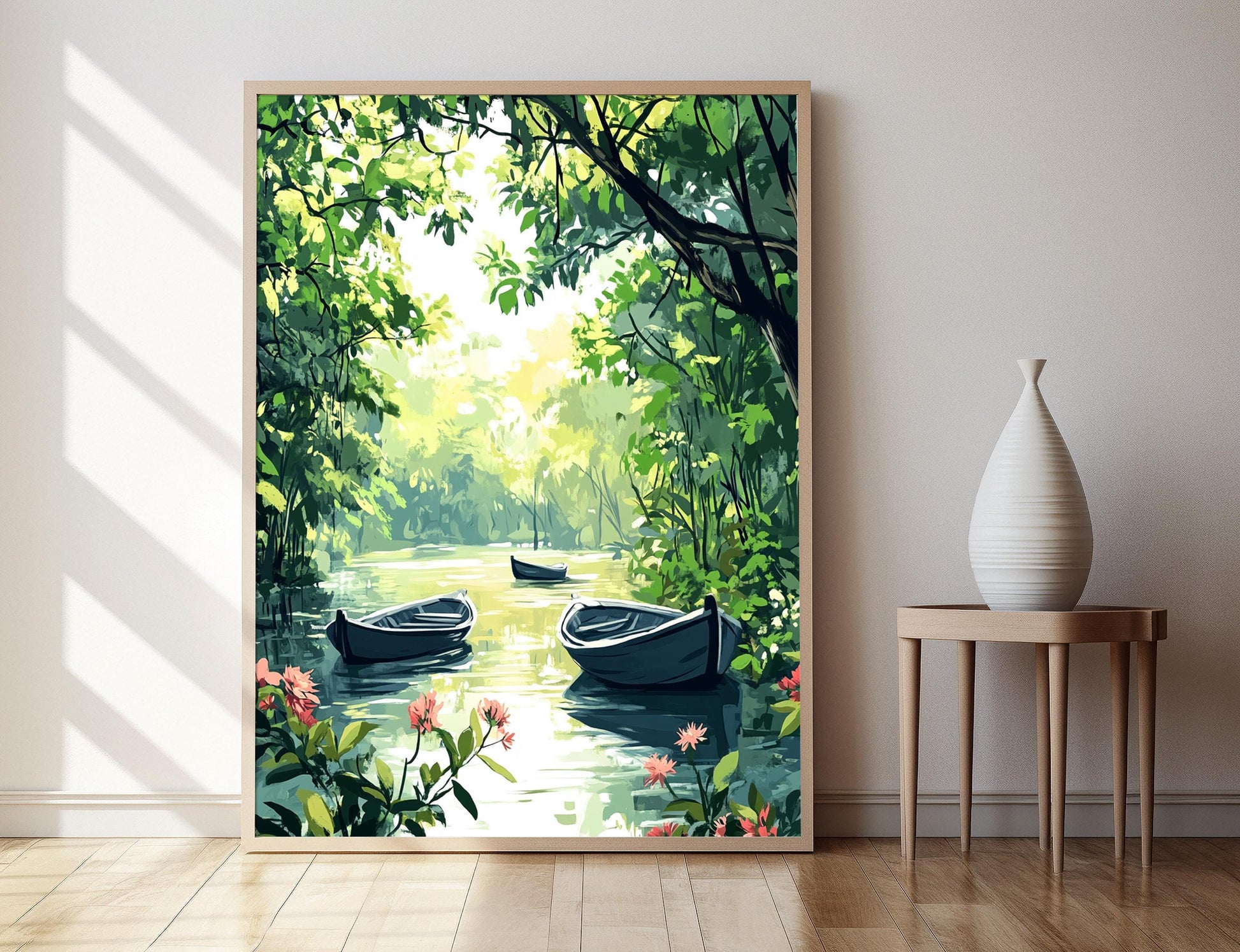 Découvrez cette magnifique affiche qui évoque la sérénité du Ratargul Swamp Forest, où des bateaux glissent paisiblement à travers des eaux calmes entourées d'une végétation luxuriante. Cette illustration captivante, parfaite pour une décoration murale apaisante, invite à la contemplation et à l'évasion vers les merveilles naturelles du Bangladesh. Transformez votre espace avec ce poster mural qui allie beauté et tranquillité.