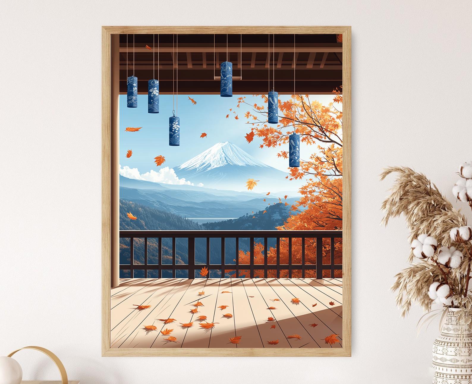 Découvrez notre affiche inspirée par l'art japonais, mettant en scène des carillons furin traditionnels se balançant sous un porche en bois. Cette illustration apaisante évoque une ambiance sereine, avec des feuilles d'érable flottantes et la majesté du Mont Fuji en arrière-plan, offrant ainsi une décoration murale qui apportera une touche de tranquillité à votre intérieur. Un véritable art mural qui capture la magie des douces mélodies d'été.