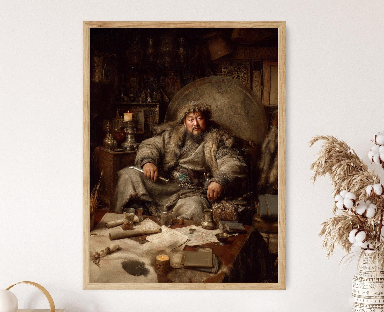 Découvrez cette magnifique affiche qui capture l'essence historique de Genghis Khan, assis dans un yurt traditionnel, entouré de cartes et de parchemins. Cette illustration evocatrice, pleine de profondeur et de mystère, apporte une dimension captivante à votre décoration murale. Parfaite pour enrichir votre art mural, elle évoque la puissance tranquille et la stratégie d'un leader légendaire, ajoutant une touche d'élégance à votre intérieur.