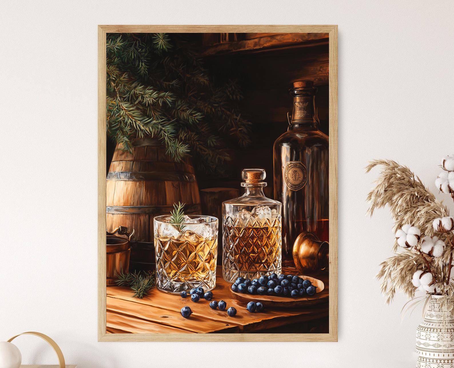 Découvrez cette magnifique affiche qui met en lumière une scène emblématique de la culture du gin néerlandais. Avec des verres à tulipe délicatement posés et des baies de genièvre, cette illustration évoque une ambiance chaleureuse et rustique, idéale pour enrichir votre décoration murale. Transformez votre espace avec ce poster mural qui célèbre l'art mural de la convivialité et de l'authenticité.