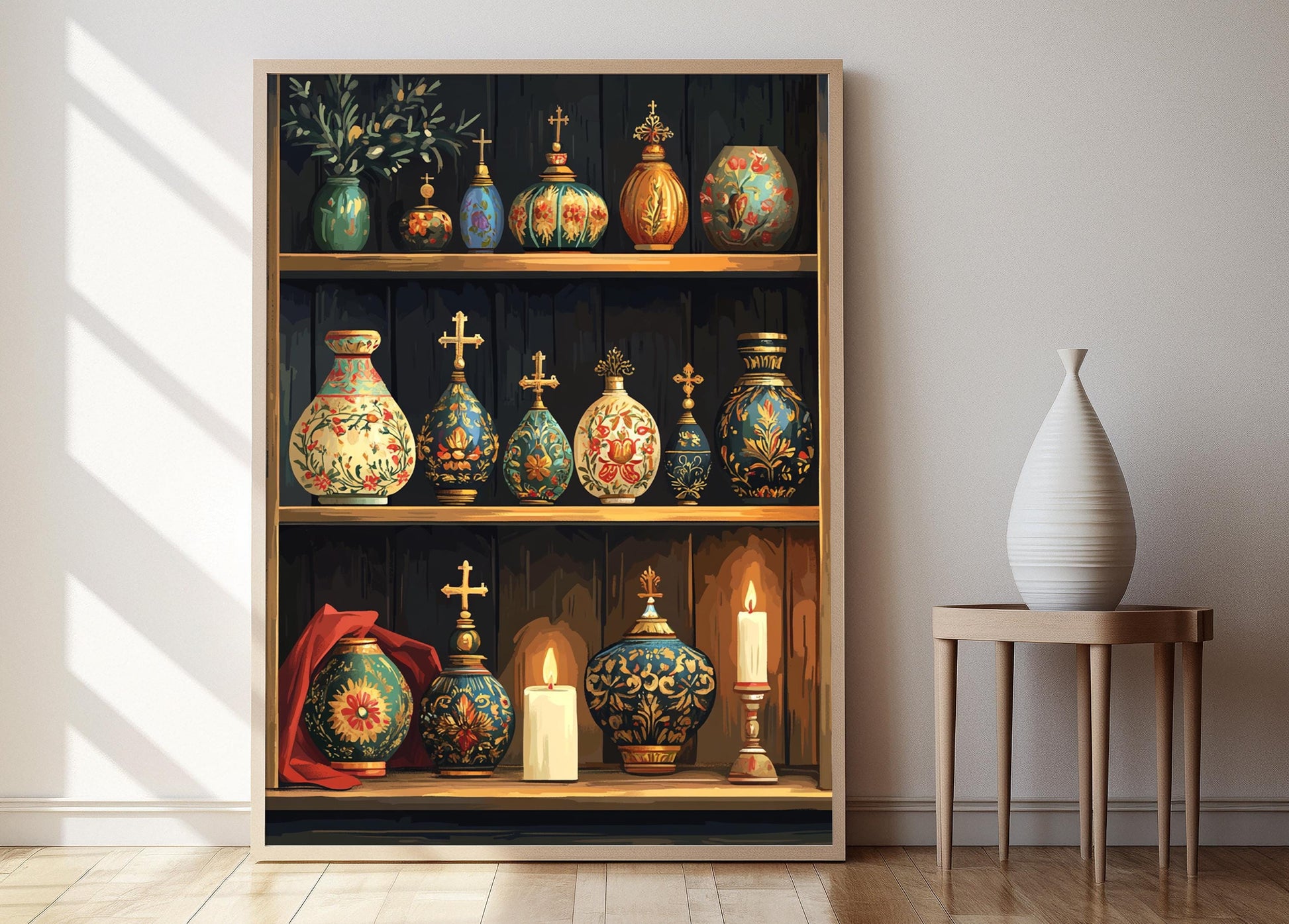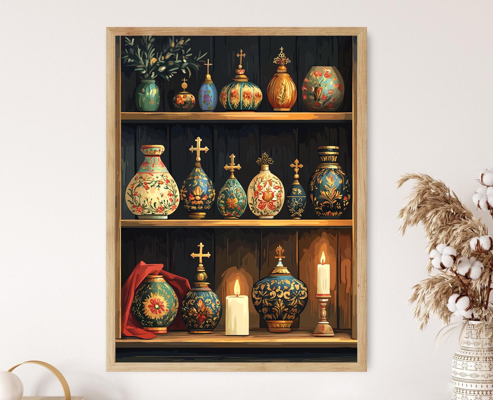 Découvrez notre affiche captivante qui met en avant des ornements décoratifs inspirés des dômes d'église russes. Cette illustration mêle des motifs en émail doré et coloré, créant une ambiance chaleureuse et spirituelle sous la lueur douce des bougies. Parfaite pour enrichir votre décoration murale, ce poster mural évoque une harmonie entre tradition et esthétique, ajoutant une touche d'art mural unique à votre intérieur.