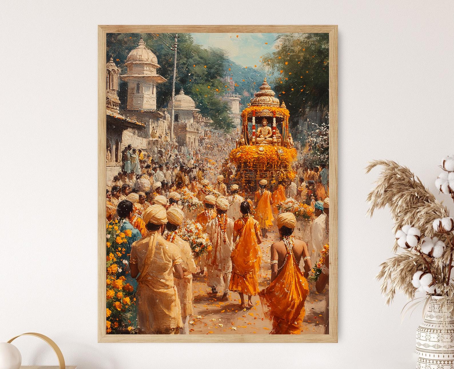 Découvrez notre affiche captivante représentant le majestueux défilé de Gudi Padwa, où des performers de dhol-tasha et des danseurs de lezim animent une palkhi richement décorée. Cette illustration vibrante évoque la joie et la festivité du Maharashtra, apportant une touche d'énergie et de couleur à votre décoration murale. Idéale pour embellir votre intérieur, cet art mural saura séduire tous les amateurs de culture et de tradition.