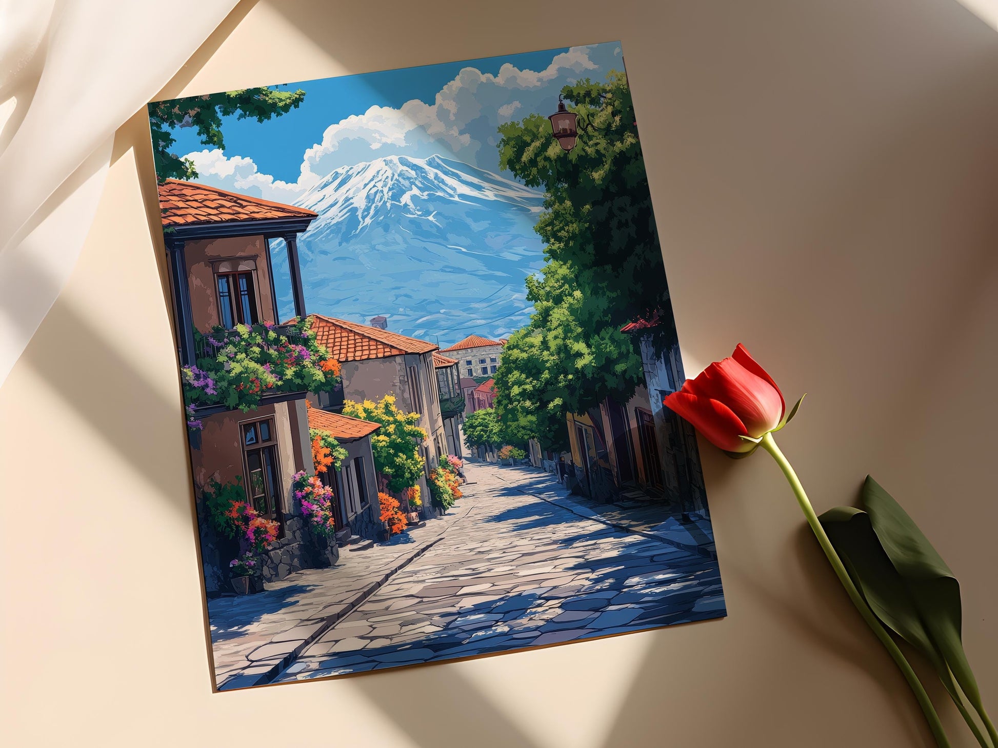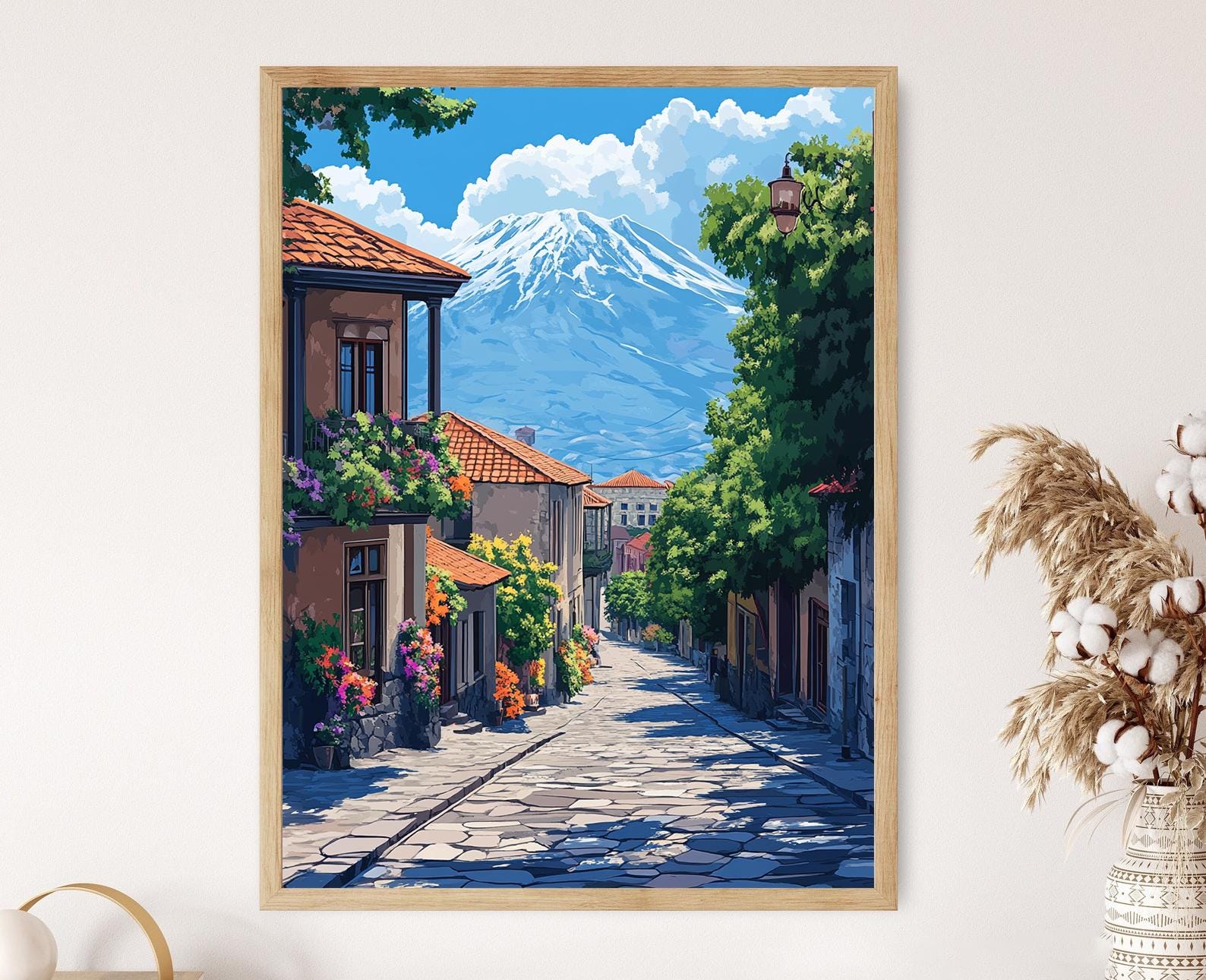 Découvrez notre affiche captivante représentant le paysage urbain de Gyumri, où l'illustration colorée des bâtiments historiques se marie harmonieusement avec des vues montagneuses majestueuses. Ce poster mural évoque un charme culturel unique, apportant une touche d'authenticité à votre décoration murale. Laissez-vous séduire par l'émotion et la beauté de l'art mural arménien, parfait pour enrichir votre intérieur.