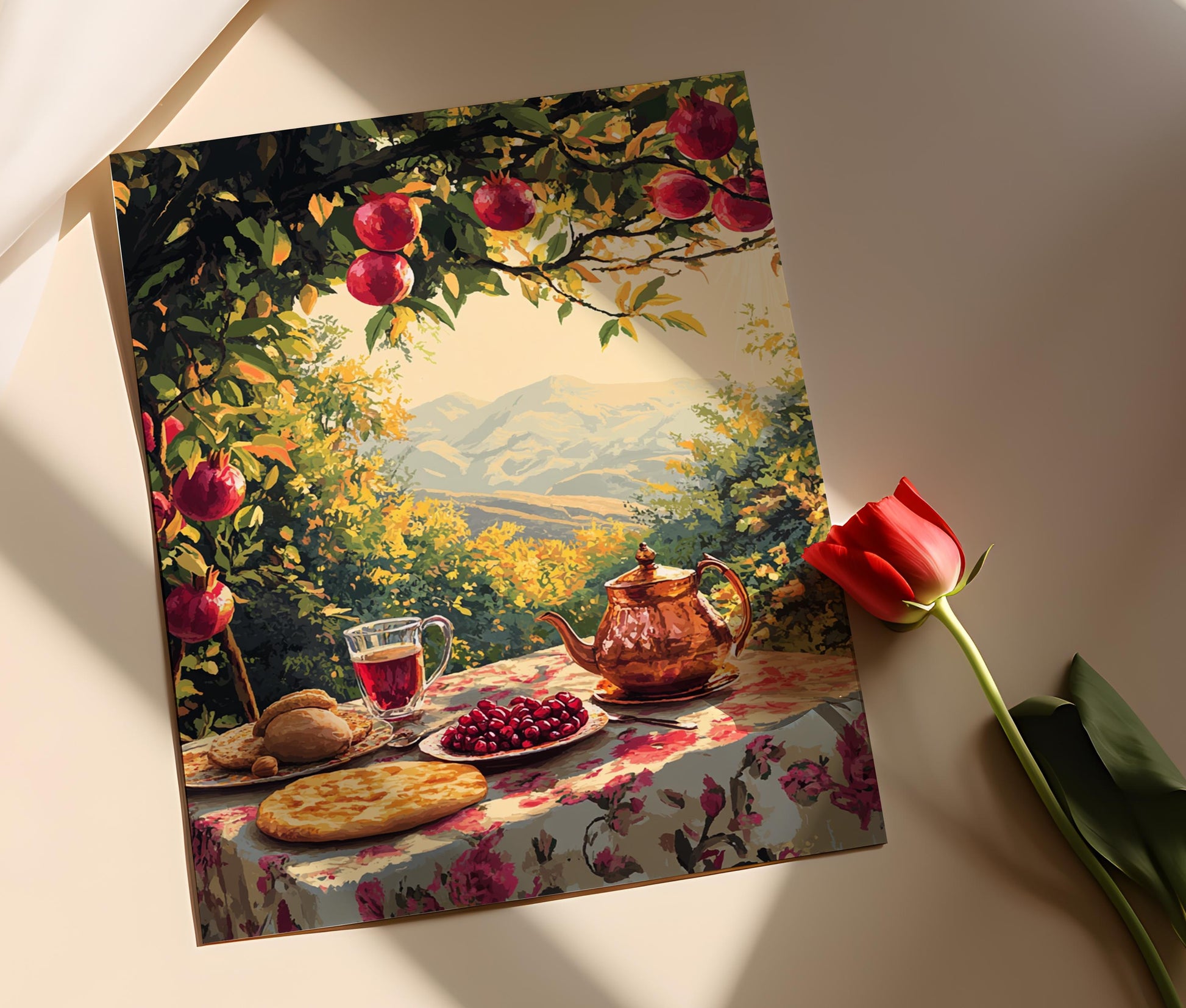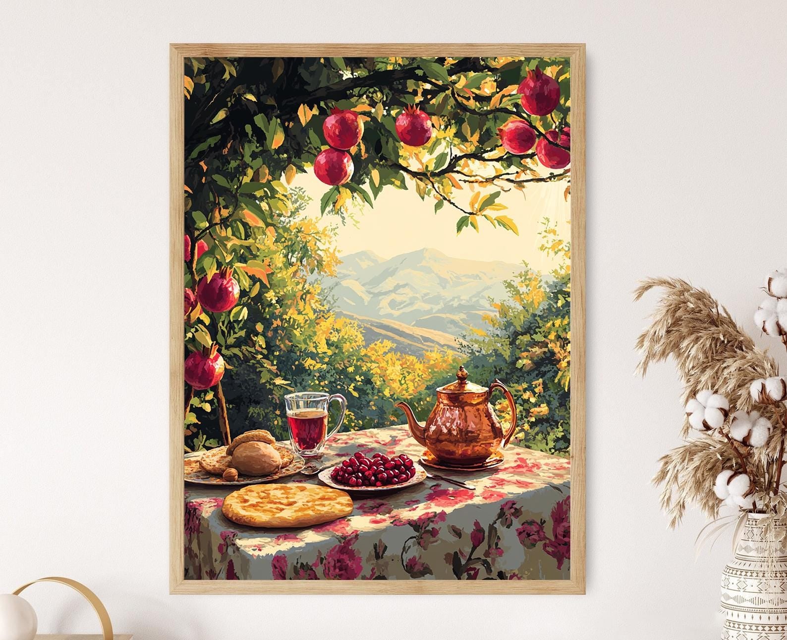 Découvrez cette affiche apaisante qui met en scène un petit-déjeuner kurde, illustrant des grenades, des noix et du pain plat au cœur d'un jardin luxuriant. Le style artistique, empreint de chaleur dorée, évoque la richesse du patrimoine de Halabja, tandis que les montagnes lointaines ajoutent une touche de sérénité. Cette décoration murale saura apporter une atmosphère chaleureuse et authentique à votre espace avec cette illustration émotive.