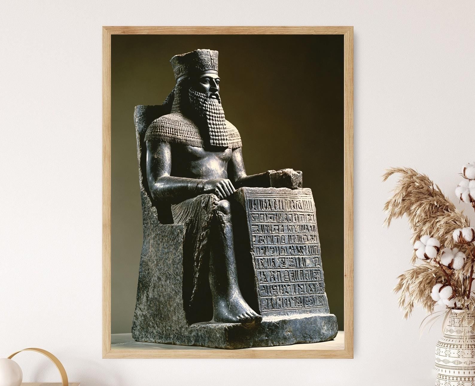 Découvrez cette affiche captivante représentant le roi Hammurabi, majestueusement assis sur son trône, avec le célèbre Code de Hammurabi gravé en cunéiforme à ses côtés. Cette illustration puissante évoque la justice et la sagesse de la Babylone antique, ajoutant une touche d'histoire fascinante à votre décoration murale. Parfaite pour enrichir votre art mural, elle séduira les passionnés de civilisations anciennes et ceux en quête d'une décoration murale unique.