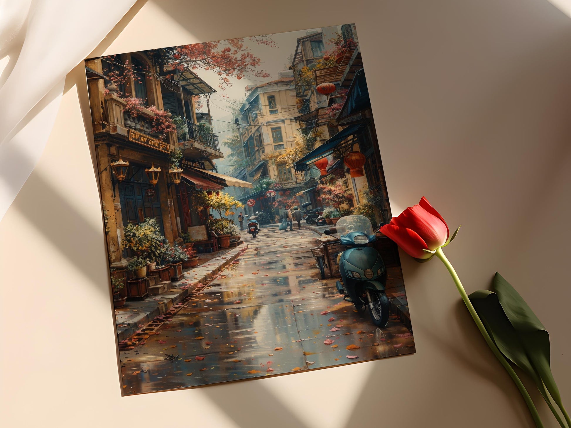 Plongez dans l'énergie vibrante de Hanoi avec cette affiche captivante, qui illustre les rues animées du Vieux Quartier, ornées d'architecture coloniale française. Avec ses couleurs dynamiques et sa composition évocatrice, cette décoration murale capture l'essence de la vie urbaine vietnamienne, offrant une invitation à explorer des ruelles illuminées par des lanternes et des marchés traditionnels. Idéale pour enrichir votre collection d'art mural, cette illustration saura séduire les passionnés de culture et d'aventure.