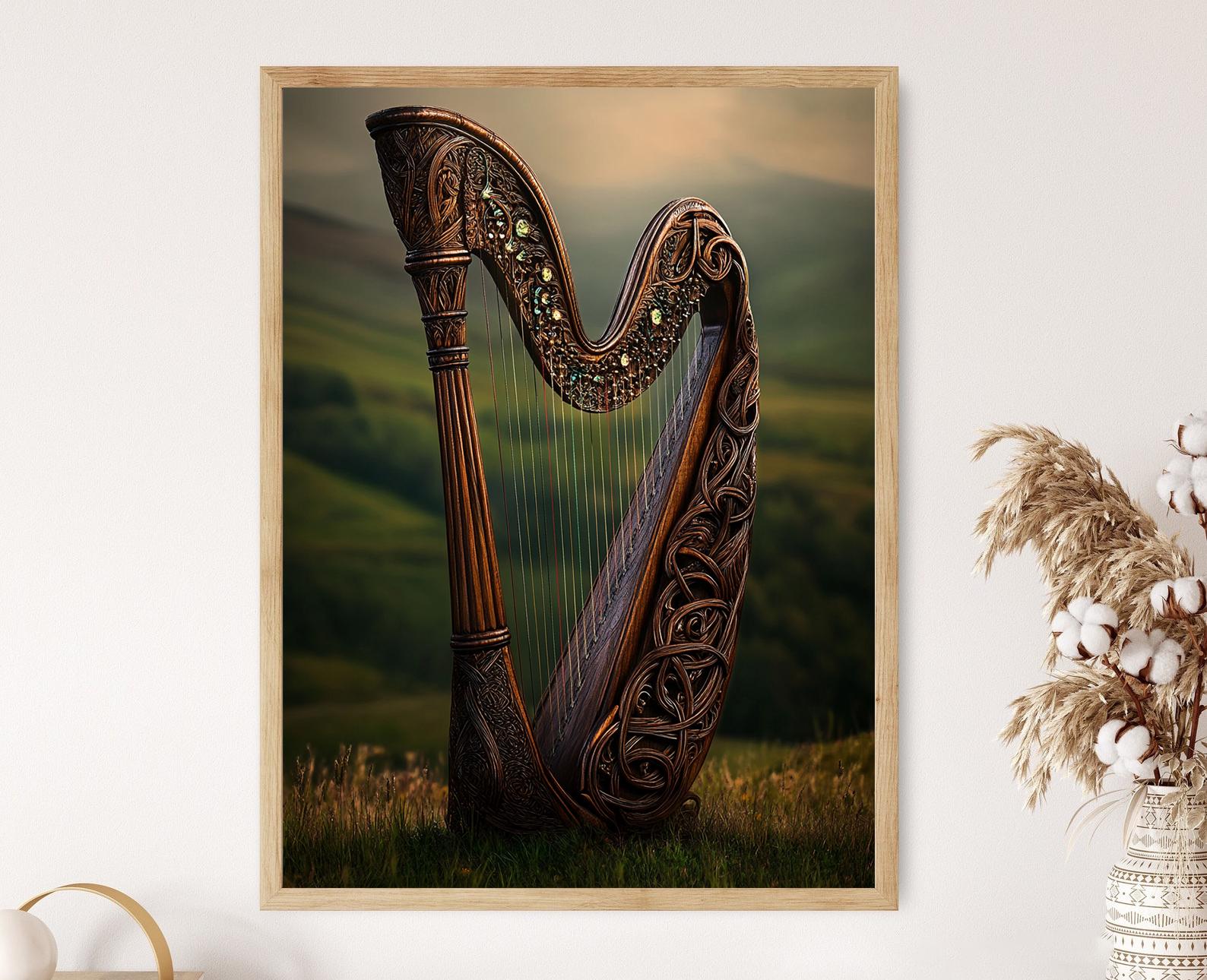 Découvrez cette magnifique affiche mettant en avant une harpe celtique finement sculptée, ornée de motifs complexes et de symboles évoquant la musique et l'harmonie. L'illustration, plongée dans un paysage serein de collines verdoyantes, évoque la beauté et la tradition de la musique celtique. Ce poster mural apportera une touche de grâce et de sérénité à votre décoration murale, transformant votre espace en une véritable ode à l'art mural celtique.