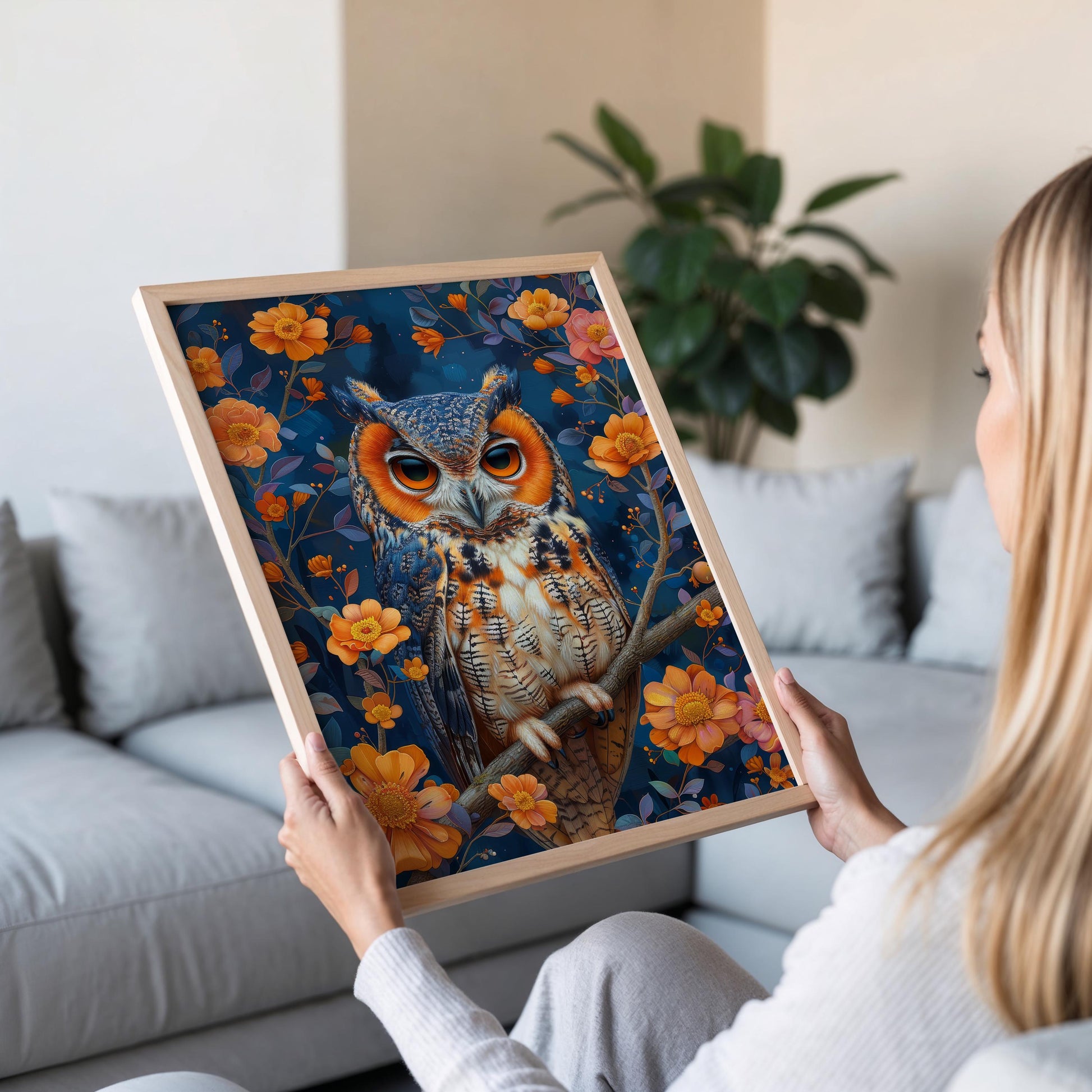 Affiche Hibou Bleu – Poster Broderie Naturelle Murale