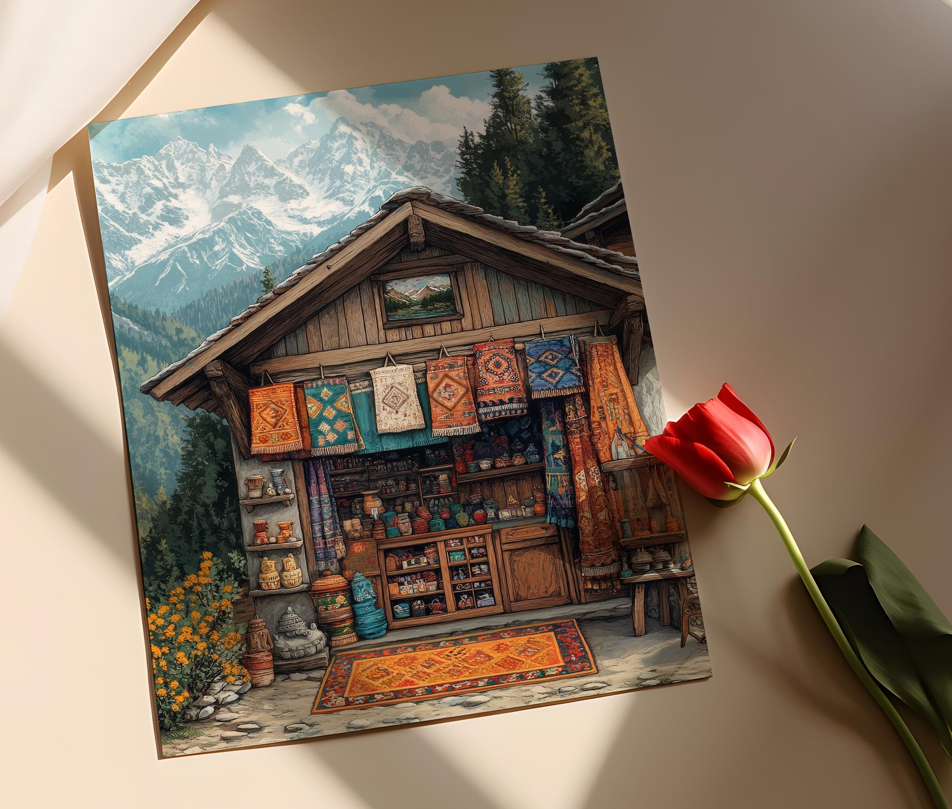 Découvrez cette magnifique affiche qui capture l'essence d'un magasin de souvenirs himachali, où l'artisanat traditionnel prend vie. Avec ses châles en laine, jouets en bois et sculptures en pierre, cette illustration évoque une atmosphère chaleureuse et authentique, parfaite pour enrichir votre décoration murale. Ce poster mural est une véritable célébration des traditions artisanales de Himachal Pradesh, apportant une touche culturelle unique à votre art mural.