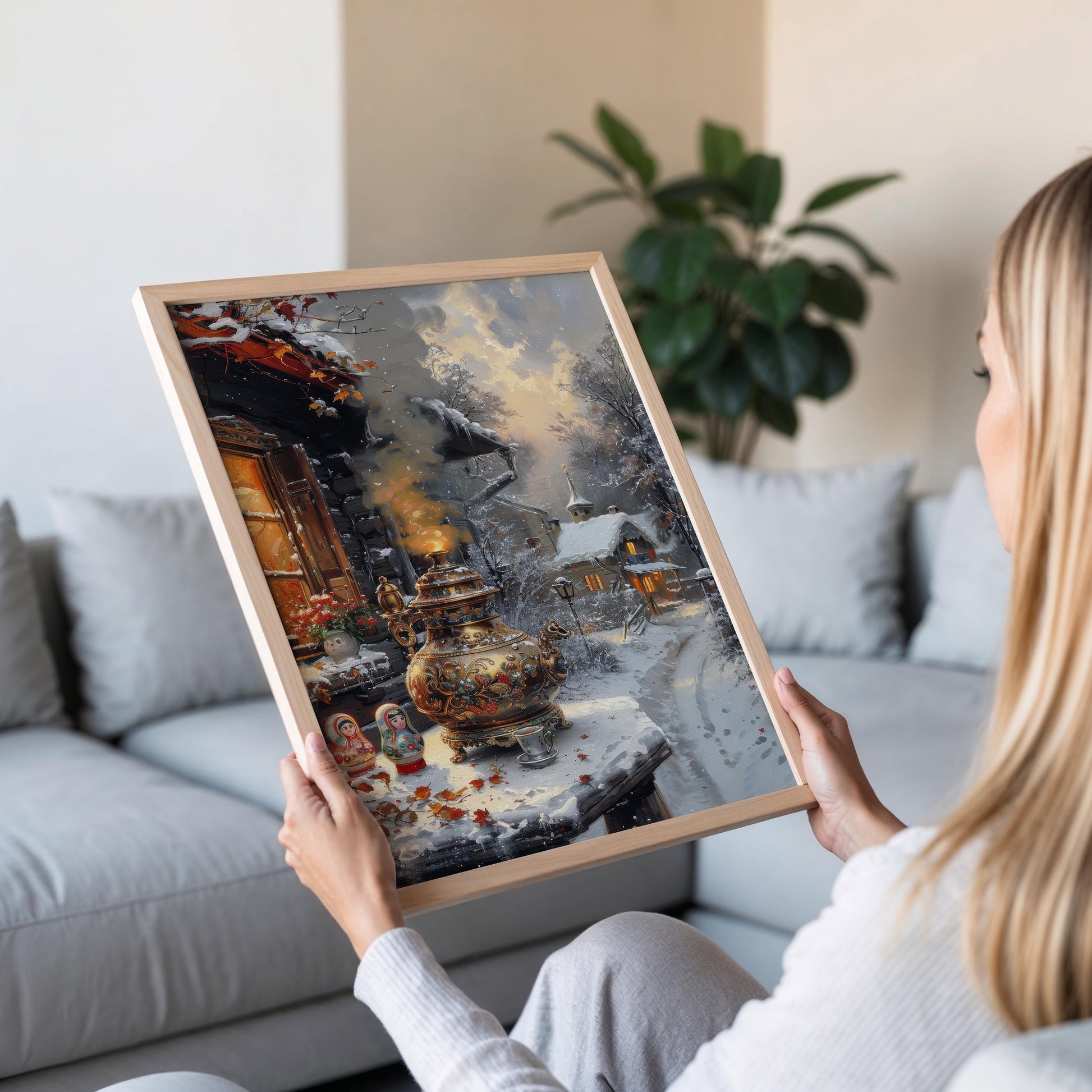 Affiche Hiver Moscou – Poster Scène de Village enneigé avec Samovar