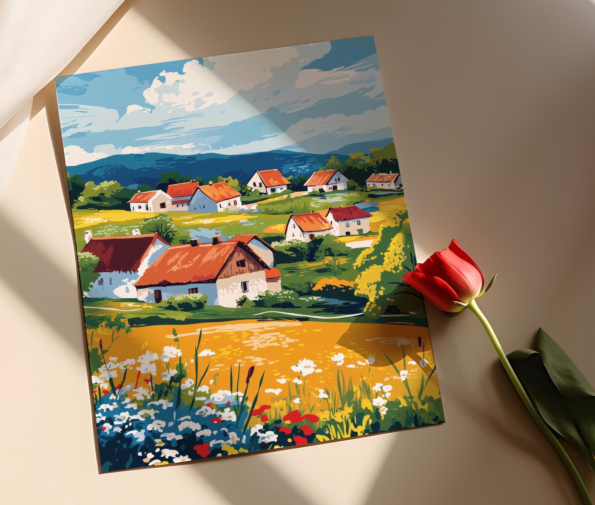 Affiche Hlebine – Poster Art Naïf Croate, Paysage Rural Élégant