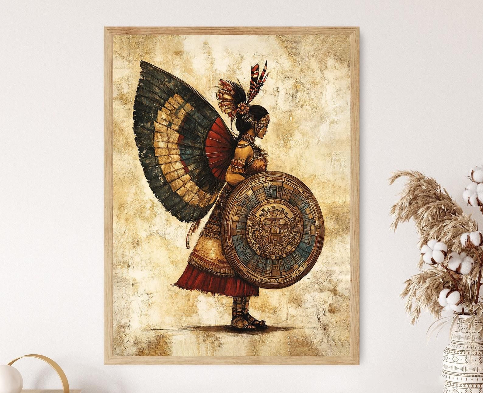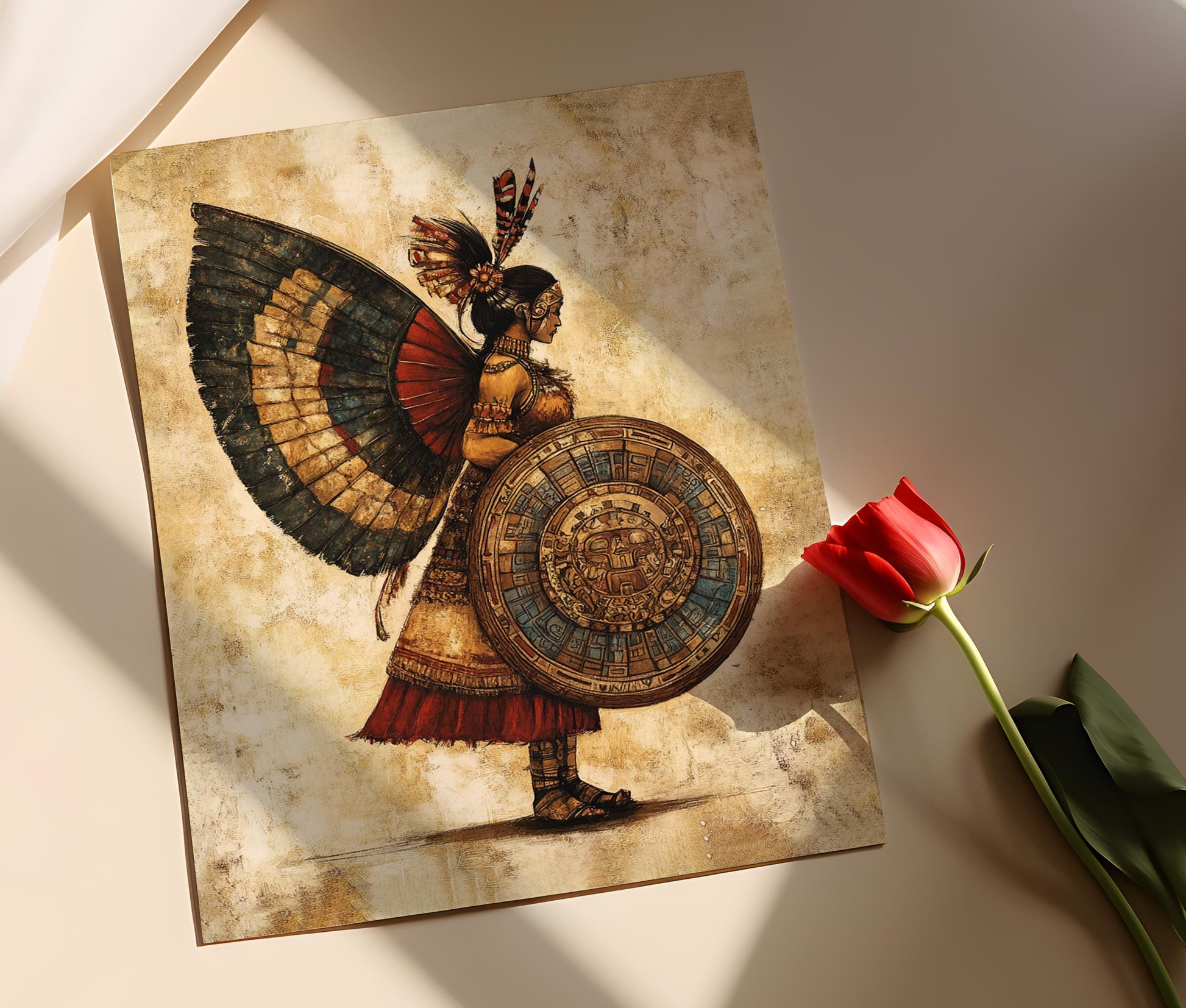 Découvrez cette affiche captivante mettant en scène Itzpapalotl, la déesse guerrière aztèque, ornée d'ailes en obsidienne et d'un bouclier décoré de symboles sacrés. Cette illustration vibrante, qui incarne la force et la résilience, apporte une touche d'énergie et de mystère à votre décoration murale. Parfaite pour les amateurs d'art mural qui souhaitent célébrer des figures féminines puissantes et la mythologie ancienne.