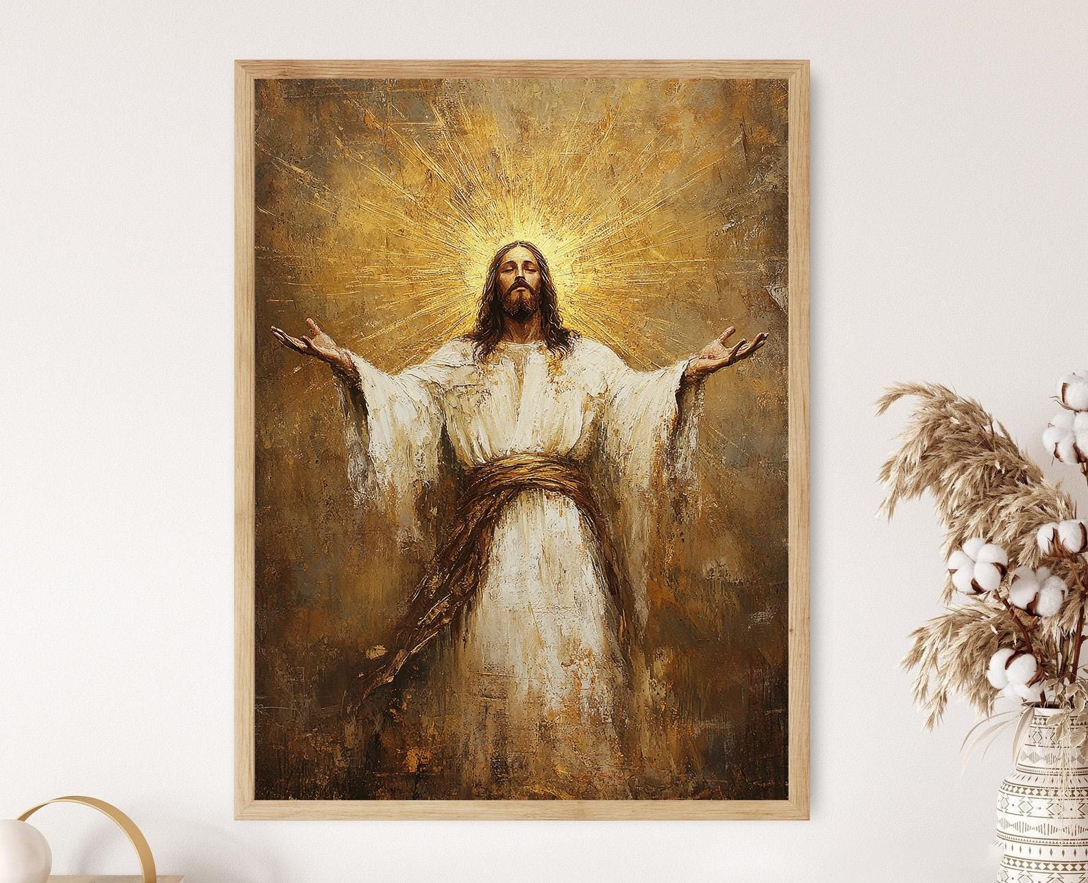 Plongez dans une atmosphère de sérénité avec cette affiche captivante représentant Jésus-Christ les bras ouverts, baigné d'une lumière dorée éclatante. Cette illustration émotive, symbole d'amour et d'espoir, transforme votre espace en une véritable œuvre d'art mural. Idéale pour enrichir votre décoration murale, ce poster mural apportera une touche d'inspiration et de paix à votre intérieur.